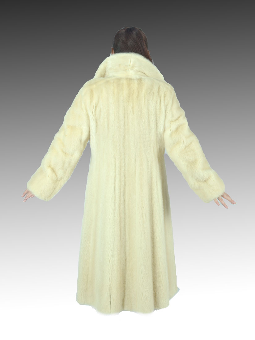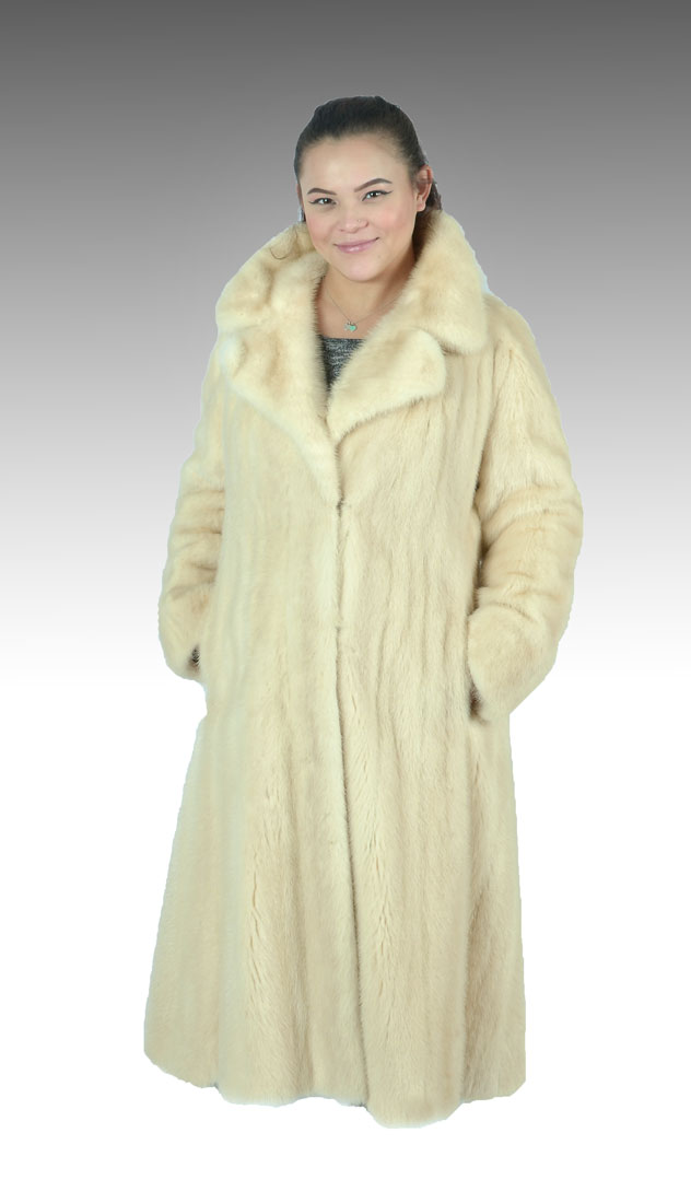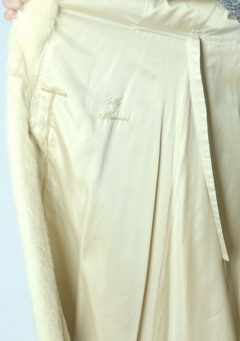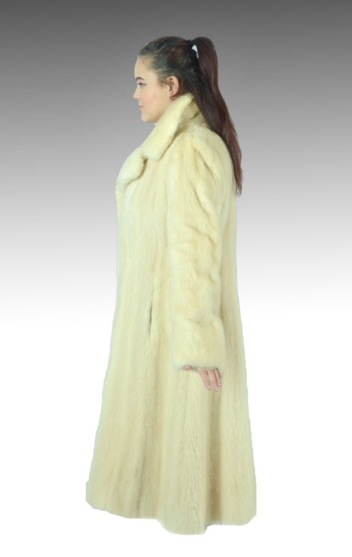 VINTAGE FULL LENGTH BLONDE MINK COAT: Full length blond mink coat has 2 side pockets and a collar that will cozy up around your neck. Satin lining has some spotting with name embroidered. 1 button closure at the neck and 2 hook and eye closures in the front. Approx size 6.