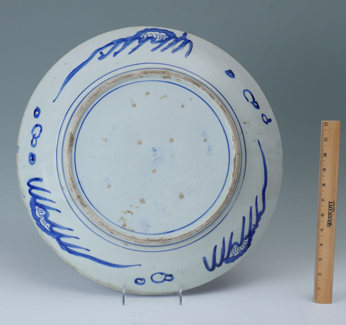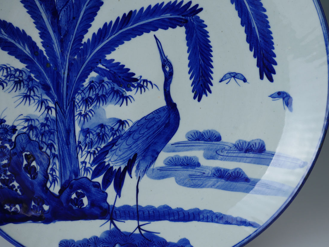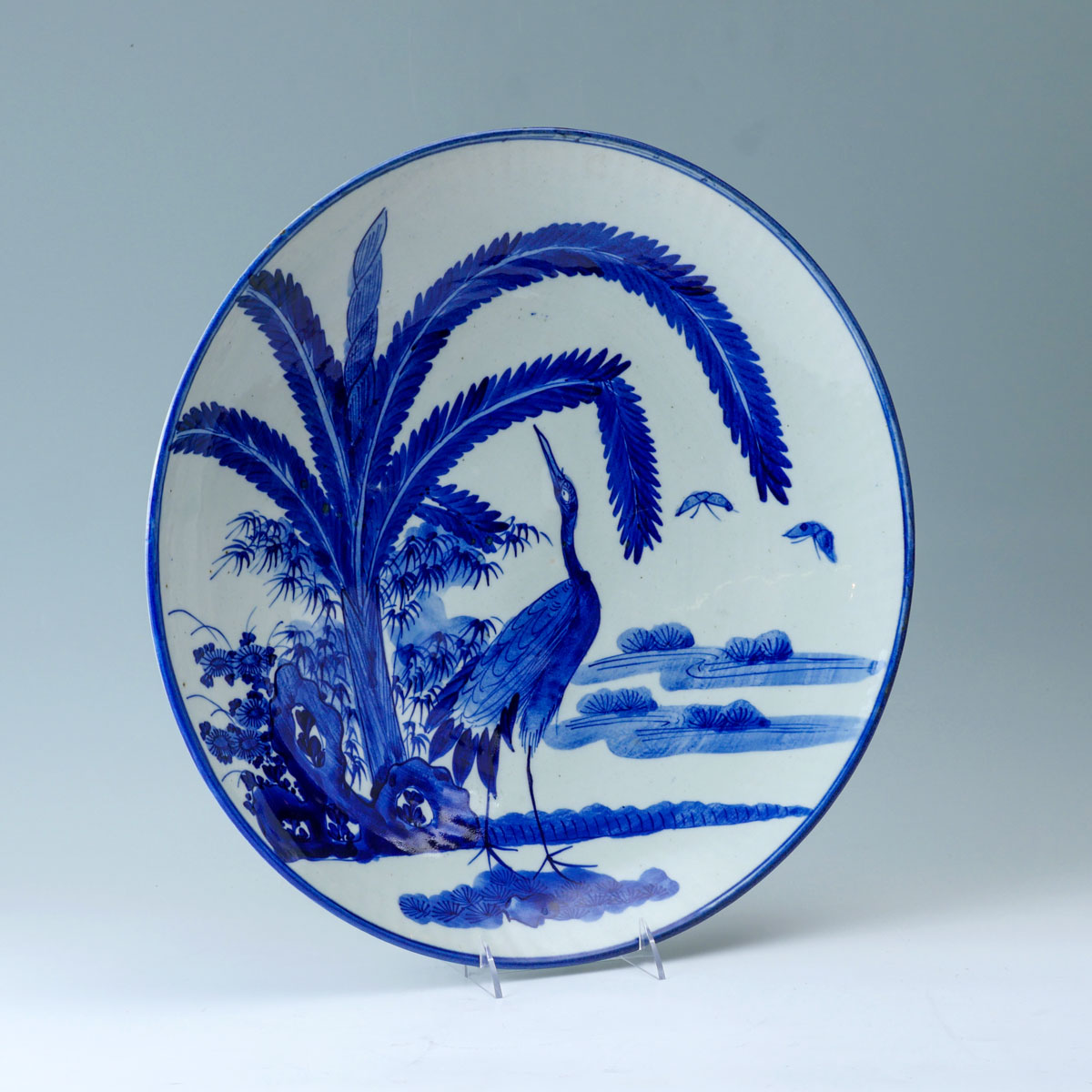 LARGE ARITA MEIJI PERIOD BLUE & WHITE CHARGER: Large hand thrown Meiji Period blue & white Crane and butterflies with foliate and water background. Illegible makers mark on verso. Approx. 3'' deep x 18'' wide.