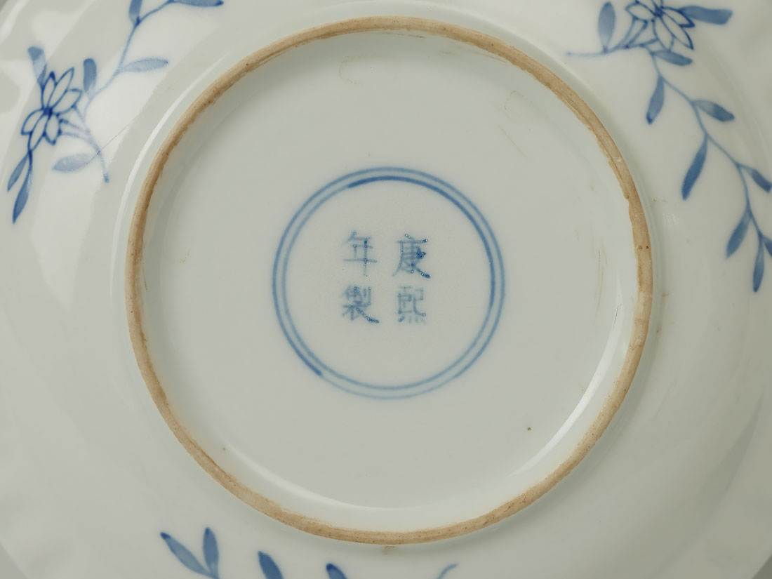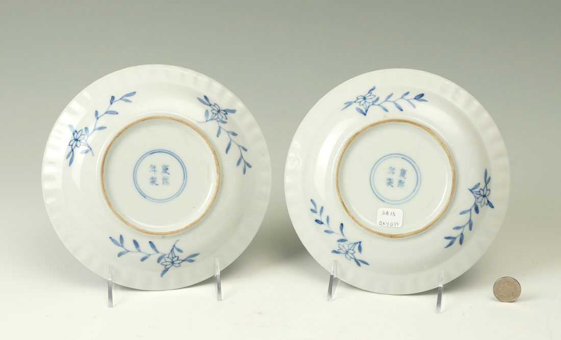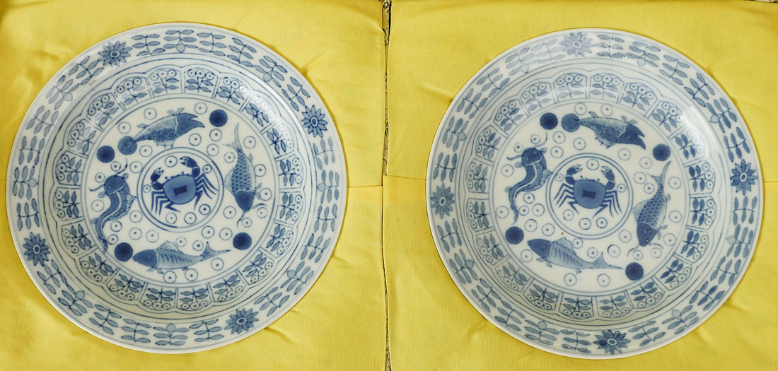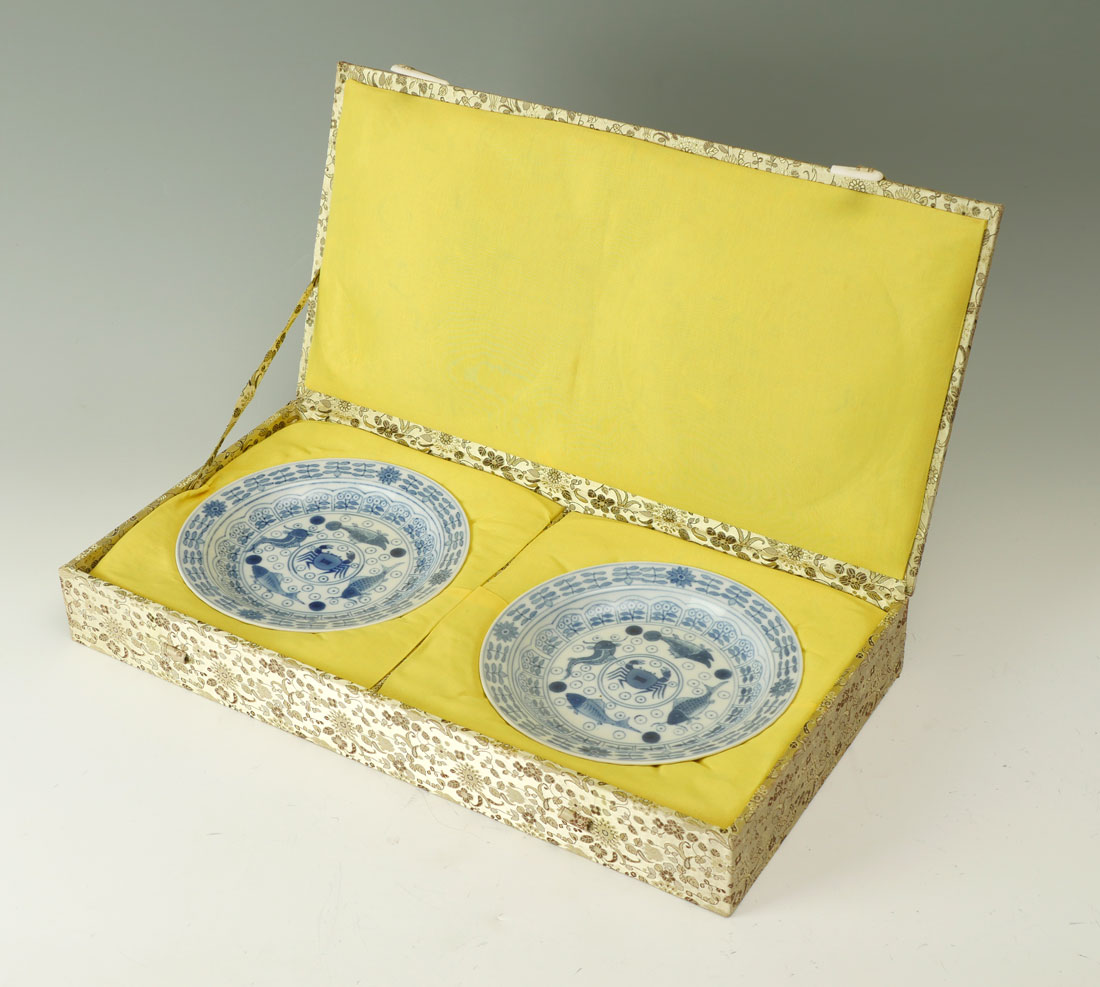 PAIR OF QING DYNASTY BUDDHIST PLATES IN PRESENTATION BOX: 2 hand painted Blue & White Buddhist motif plates. 4 fish and crab in center with floral and foliate design bordering. Flower and foliate on underside rim with double ringed kanji in center. Kanji reads ''Kangxi Period Make''. Plates date 1900-1910. Both plates reside in a scrolling floral and foliate silk exterior with a yellow silk interior. Plates Approx. 1.25'' h x 8'' w. Presentation box Approx. 2.75'' h x 19.5'' l x 10'' w.
