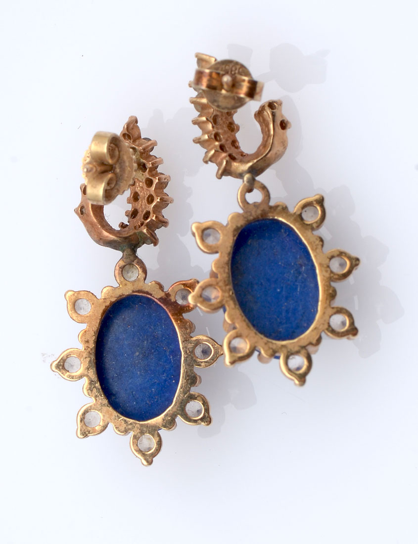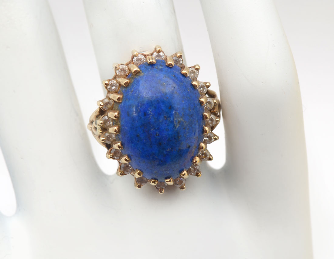 14K LAPIS & CZ RING/EARRING SET: 14K white gold ring and earrings contain round faceted CZ's and three cabochon cut pieces of Lapis Lazuli. Post and nut closures. Gold Weight: 16.7 grams. Ring size: 8