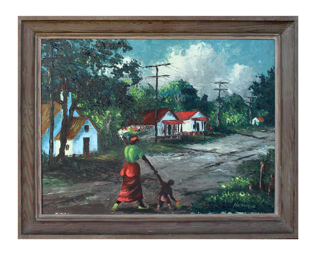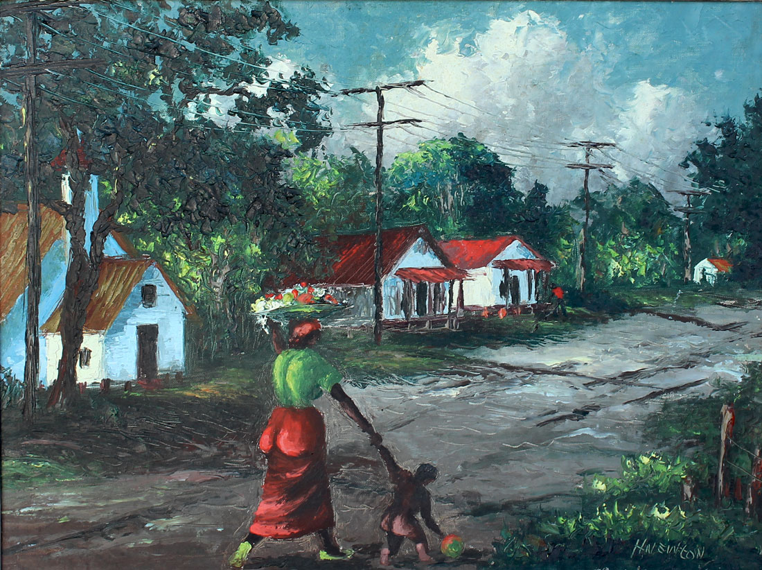 NEWTON, Harold, (American, 1934-1994): Florida Highwaymen Street Scene with Mother and Child Walking, Oil/Canvasboard, 18'' x 24'', signed lower right, framed, 22'' x 28''.