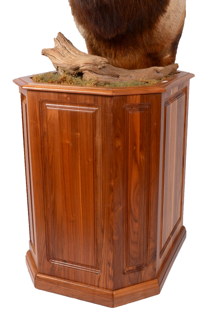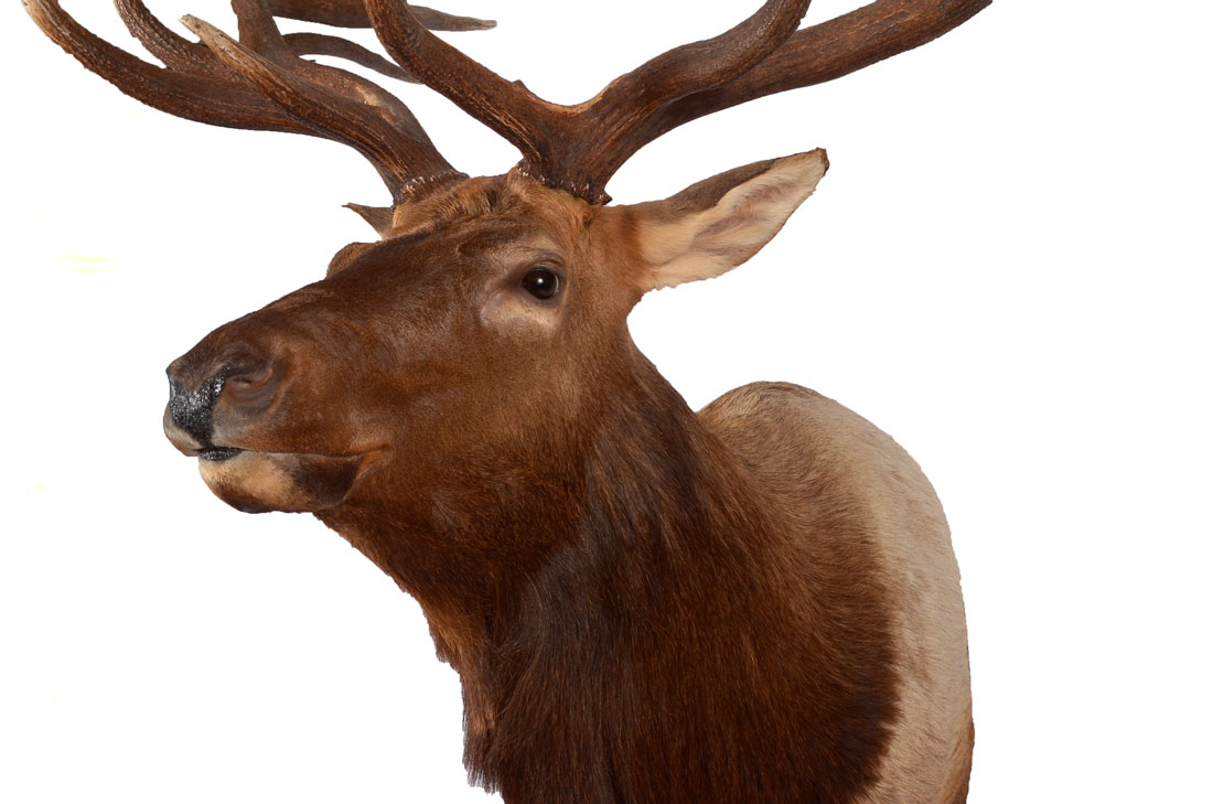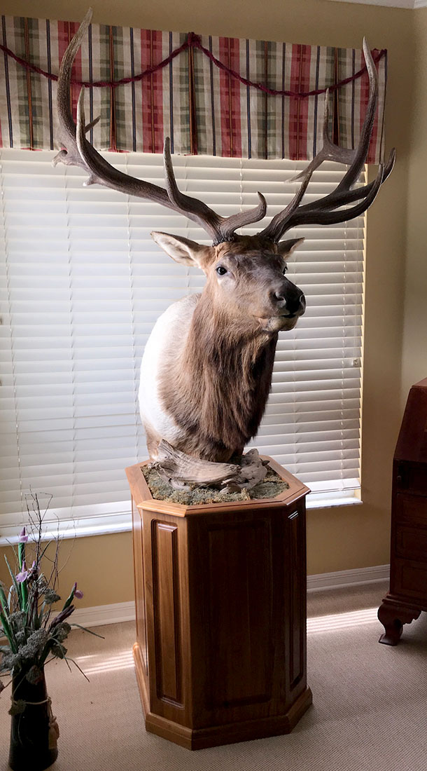 LARGE 14 POINT TAXIDERMY ELK ON STAND: This Elk has a massive 14 point rack, 6 on left, and 8 on right. Shoulder mounted to a wooden framed stand with recessed beveled panels. Mounted wood and moss atop of stand. This is the work of a highly skilled Taxidermist. Mount and stand Approx. 99.25'' h x 54'' l x 45.5'' w. Stand Approx. 34.75'' h x 31.75'' l x 26'' w.