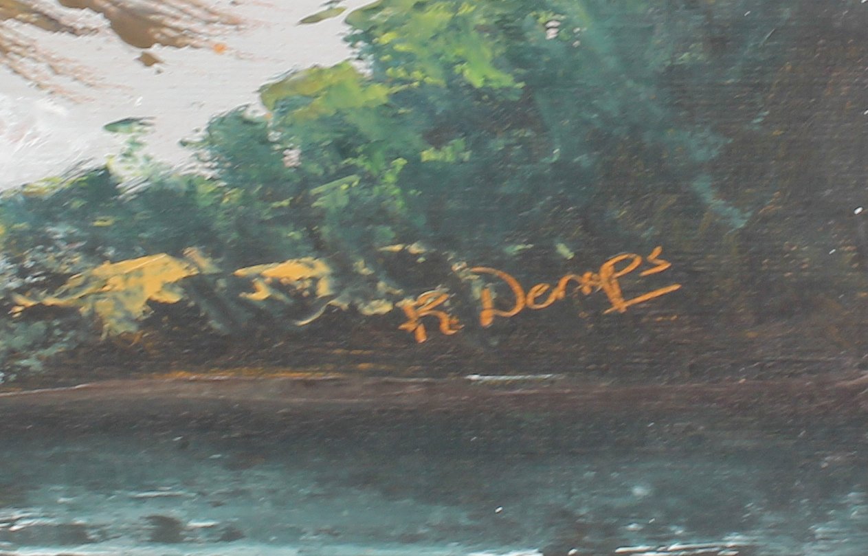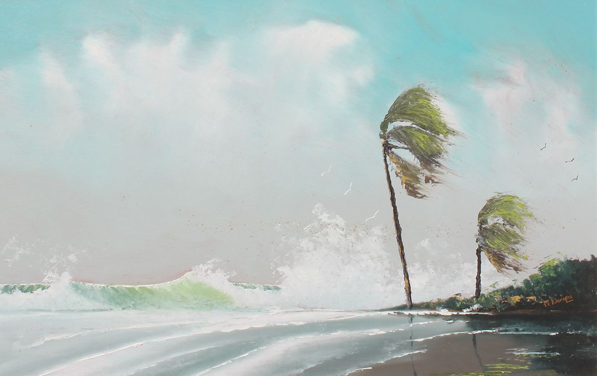 DEMPS, Rodney, (American, 20th Century): Florida Highwaymen beach scene with crashing surf, palm trees and birds in flights, Oil/Upson, signed lower right, 22 1/2'' x 34 1/2'', framed 5 1/2'' x 37 3/4''.
