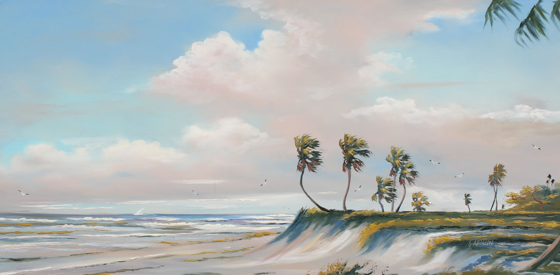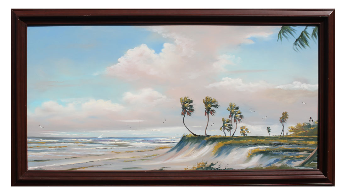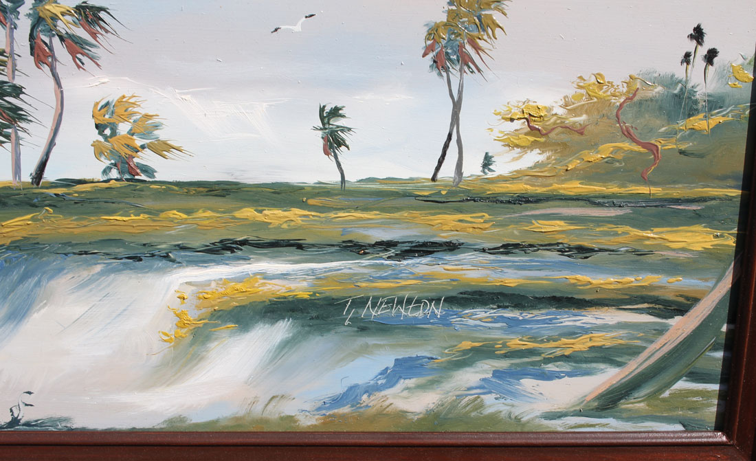 NEWTON, Tracy, (American, 21st Century): Second Generation Florida Highwaymen Rio Mar beachfront scene with palm trees, Oil/Masonite, signed lower right, 24'' x 48'', framed 29 1/2'' x 53 1/2''.