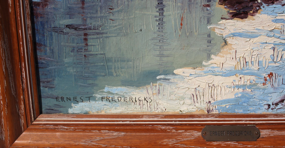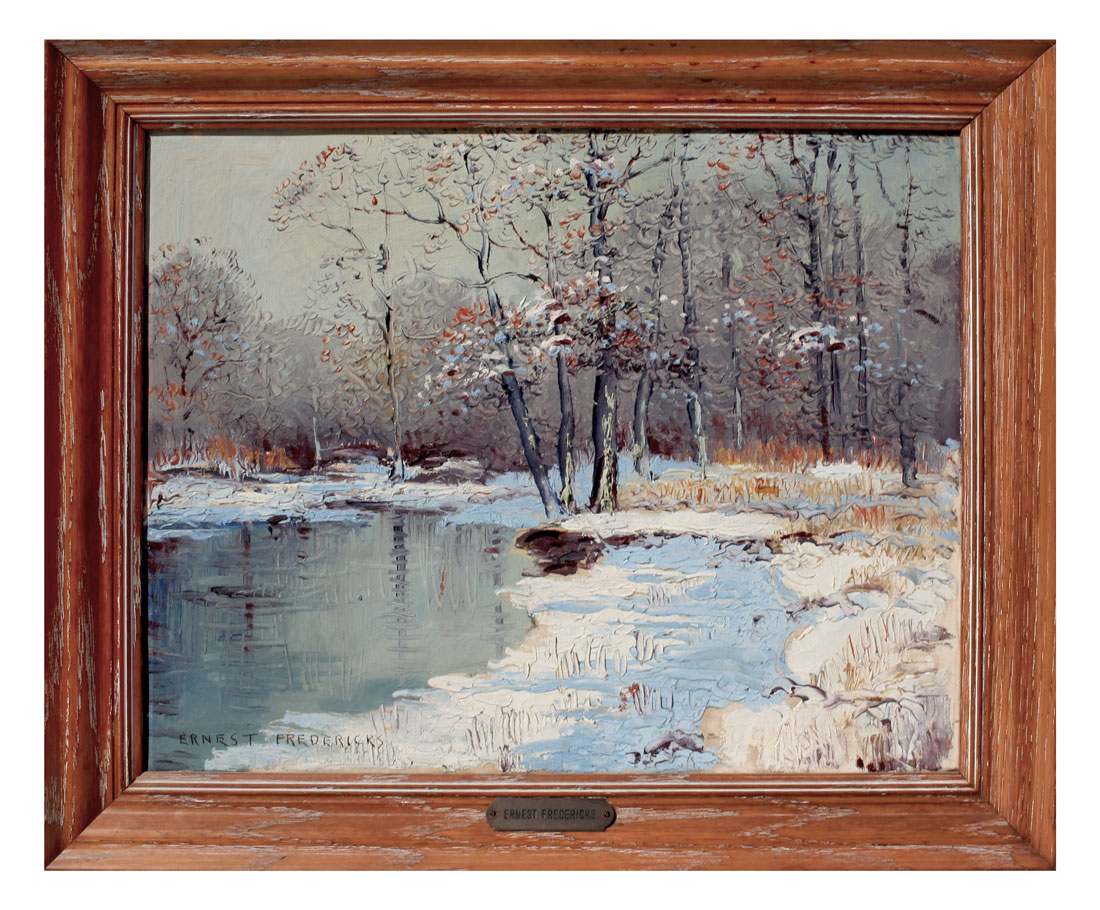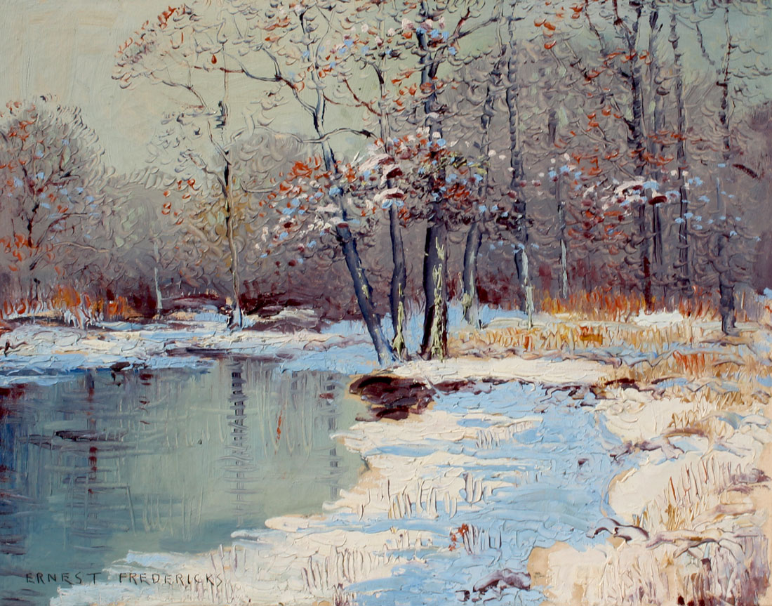 FREDERICKS, Ernest, (American, 1877-1959): Winter Stream, Oil/Canvas, 16'' x 20'', signed lower left, framed, 20.25'' x 23.5''.