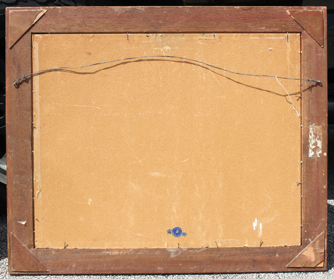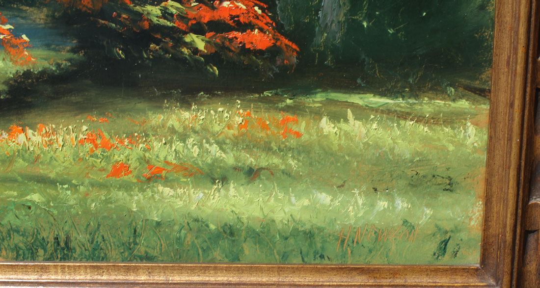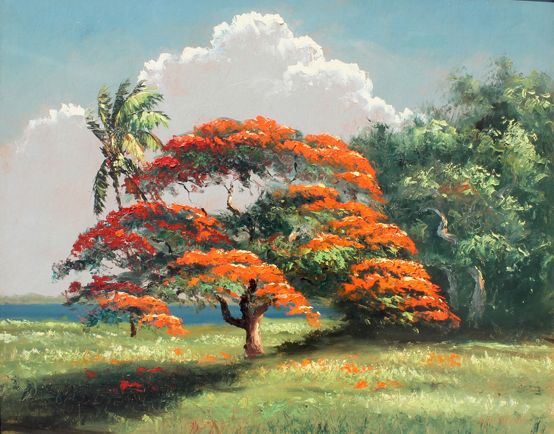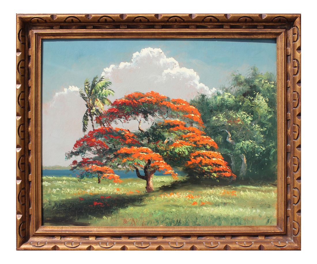 NEWTON, Harold, (American, 1934-1994): Poinciana Highwaymen Landscape Painting, Oil/Upson, 24'' x 30'', signed lower right, A. E. Backus Gallery label affixed verso, carved frame possibly framed by Newton himself is 30'' x 36''.