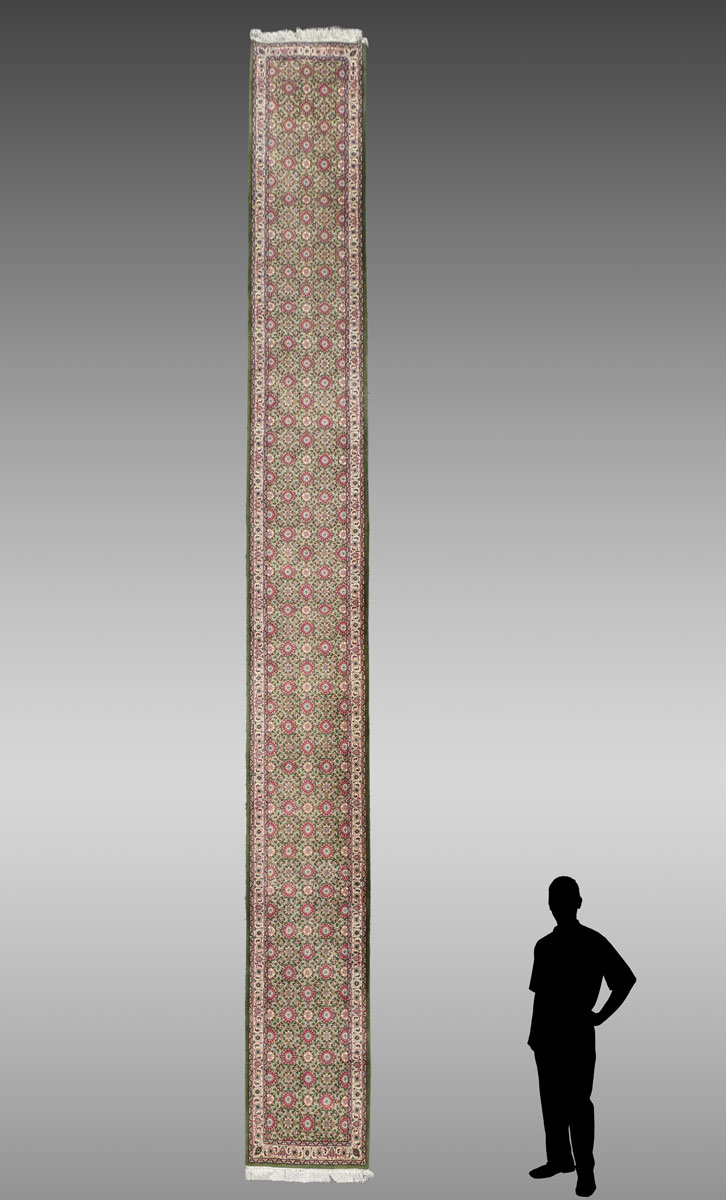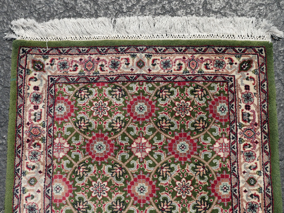 INDO-PERSIAN HAND KNOTTED WOOL RUNNER, 2'7'' X 21'11'': This very long very lovely runner has a pink, red, and green lattice work look repeating design over the whole field.