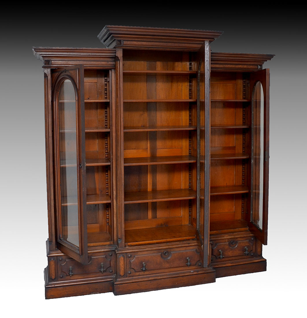 VICTORIAN RENAISSANCE WALNUT BOOKCASE: 3 door inset beveled arched glass in walnut framework and attached burlwood accents. 3 drawers reside below with medieval style drop knobs. Adjustable wood supports for shelving height adjustment. Approx. 82.25: h x 78.5'' l x 19.5'' w.