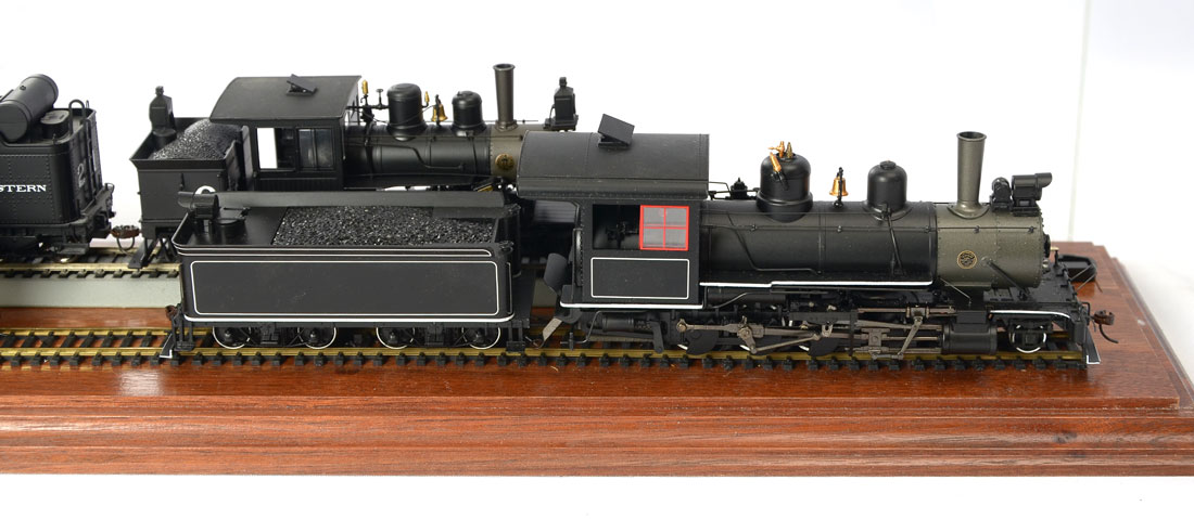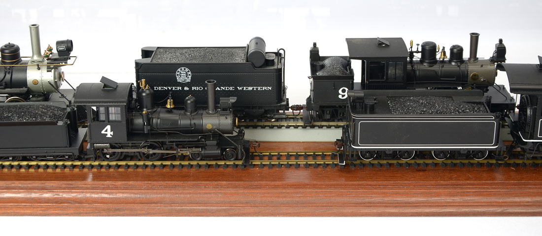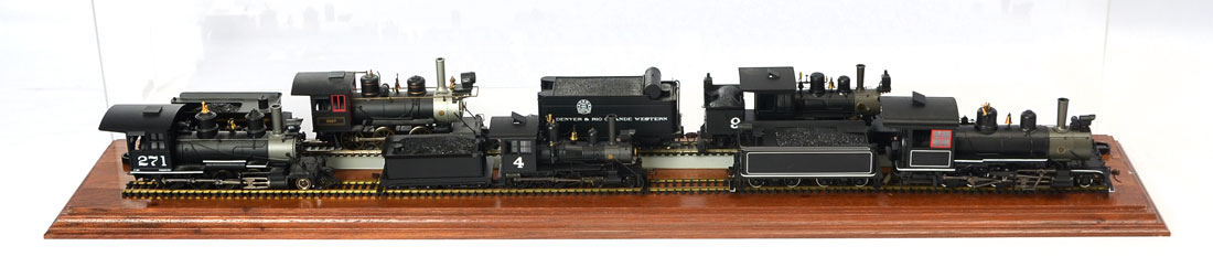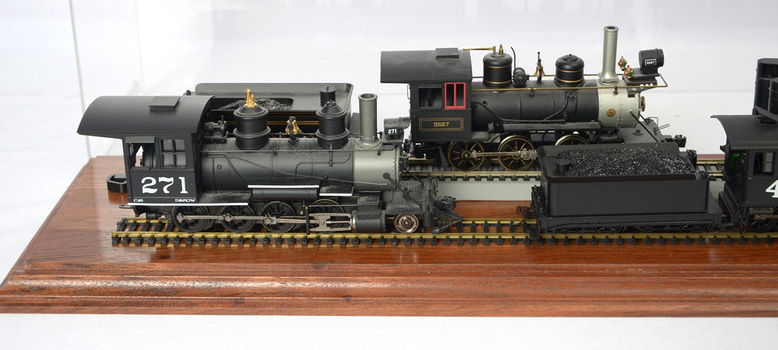 5 CASED HO SCALE LOCOMOTIVES: 5 cased locomotive engines and 4 coal cars resting on 2 HO scale tracks that are mounted to a wood beveled base and has a fiberglass cover. The trains are made by Broadway Limited & Spectrum by Bachmann. Largest engine and coal car Approx. 3'' h x 12.5'' l x 2.25'' w. Case Approx. 9.75'' h x 37'' l x 7'' w.
