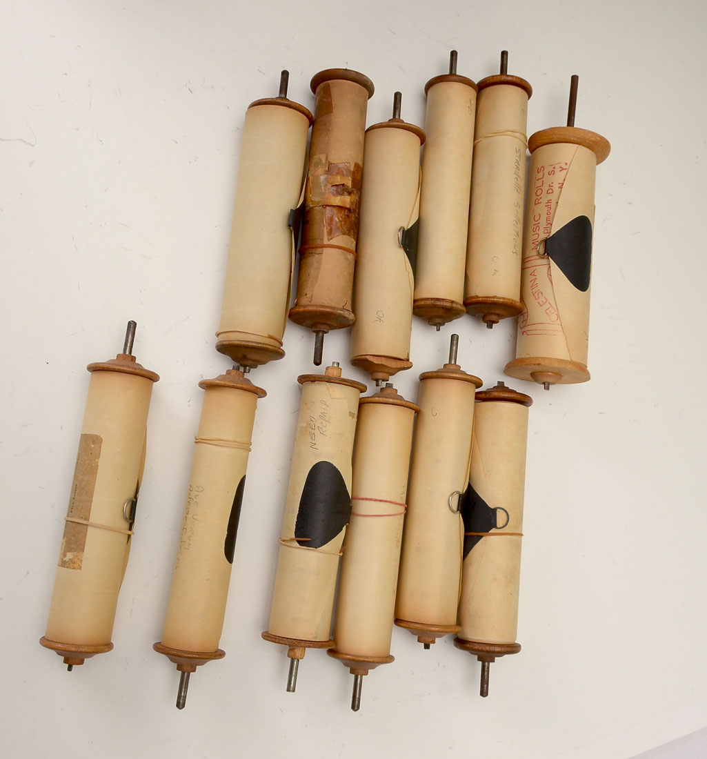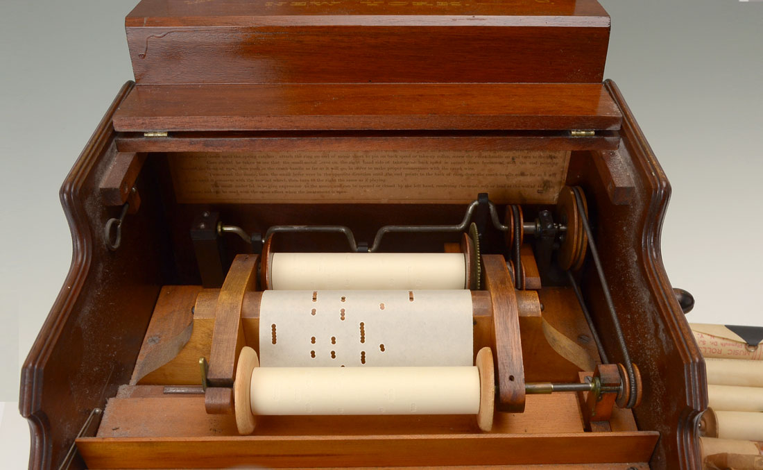 MECHANICAL CELESTINA ORGUINETTE WITH 12 ROLLS: Sometimes known as Barrel Organs or Celestinas, this example with walnut, gilt decorated hinged lid which opens to reveal maker's name Mechanical Orguinette Co. New York. Hand cranked mechanism driving paper rolls, Original paper operating instructions, single bellow 20 note range, included are 13 perforated paper music rolls. Sits upon 4 wooden button feet. Approx. 14'' h x 15.75'' l x 13.5'' w.