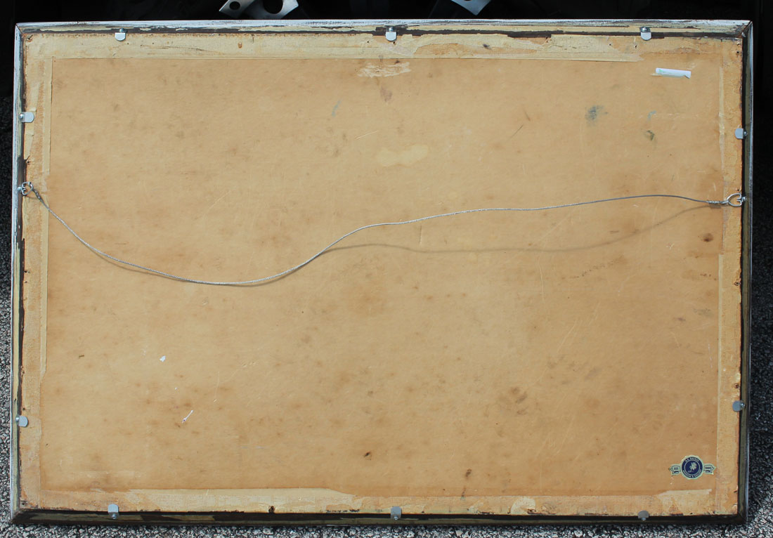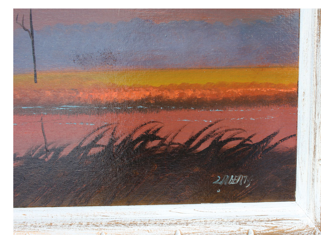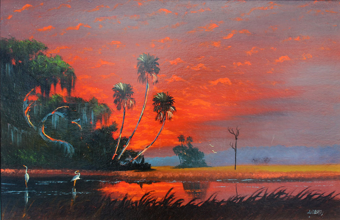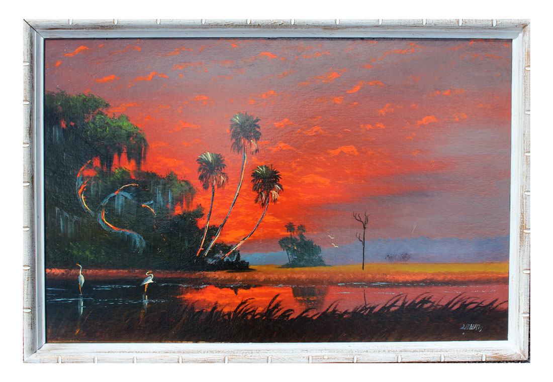 ROBERTS, Livingston, (American, 20th Century): Fire Sky Florida Highwaymen Scene with Herons and Palms, Oil/Upson, 24'' x 36'', signed lower right, A. E. Backus Museum label affixed verso, framed 25.50'' x 37.50''.