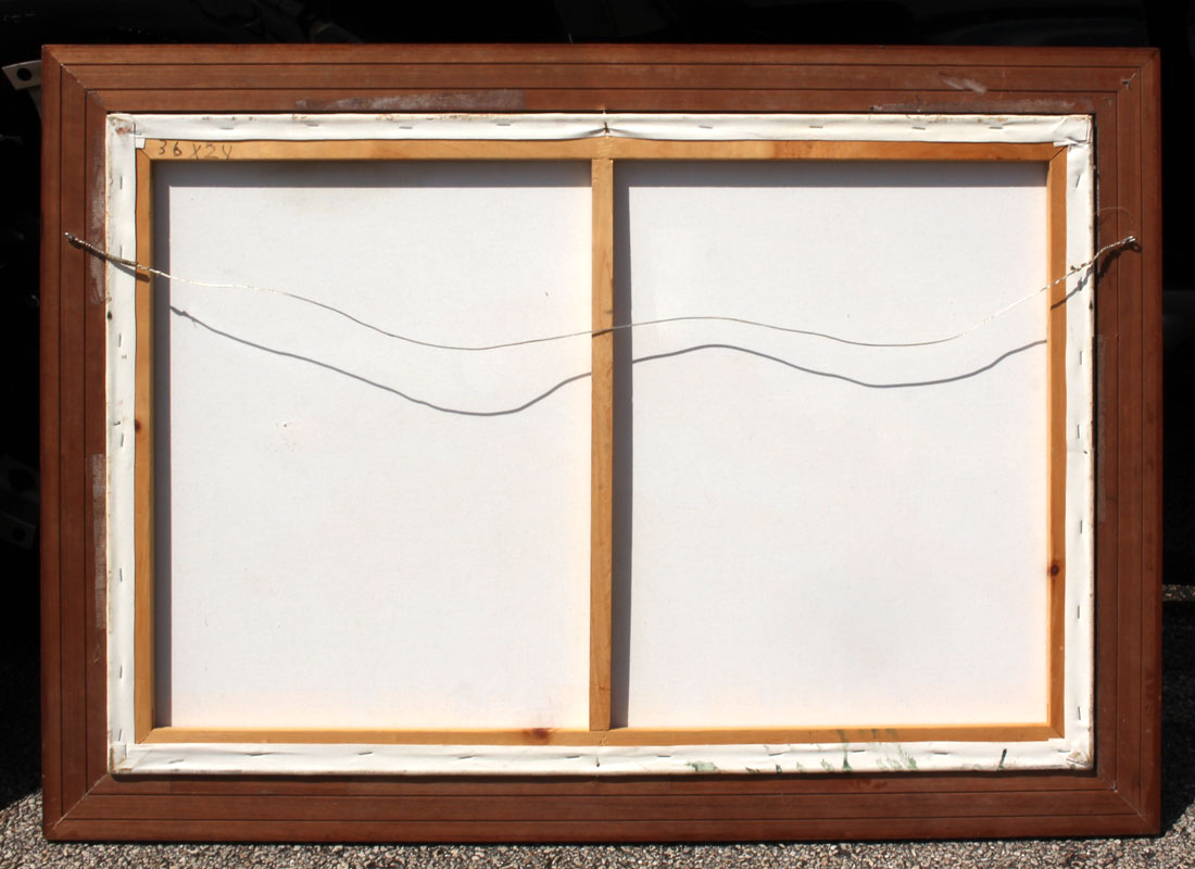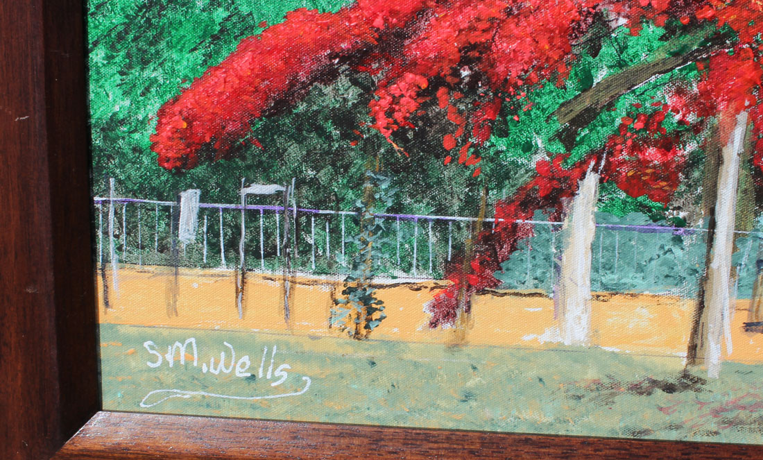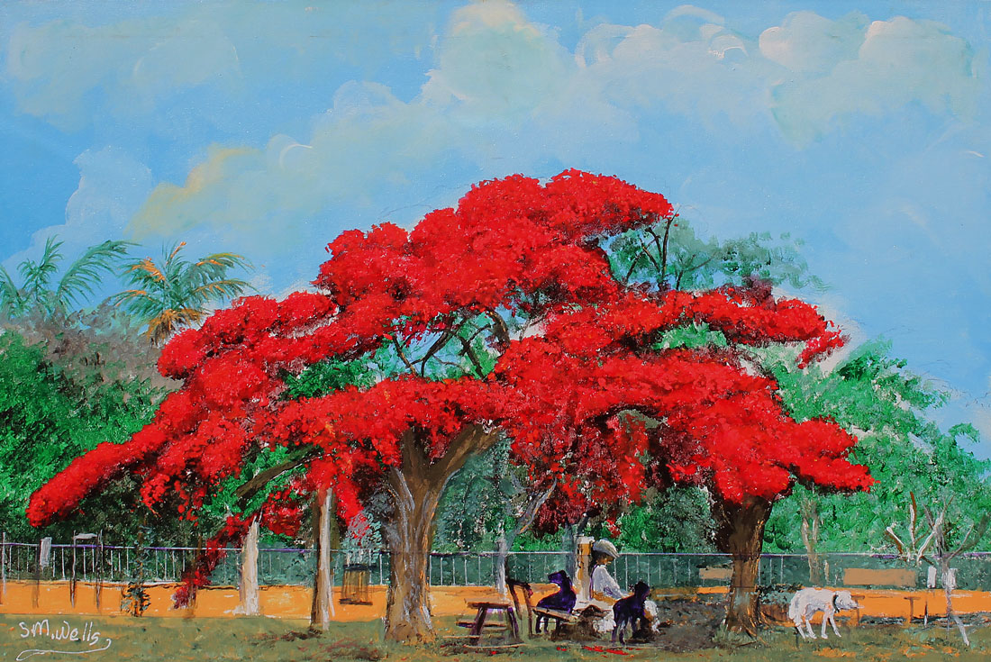 WELLS, Sylvester, (American, 1939): Florida Highwaymen Painting with Poinciana and Figure with Dogs, Oil/Canvas, 23.75'' x 36'', signed lower left, framed 29'' x 41''.