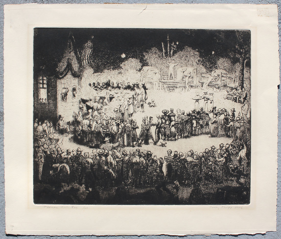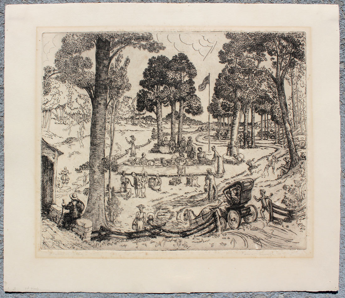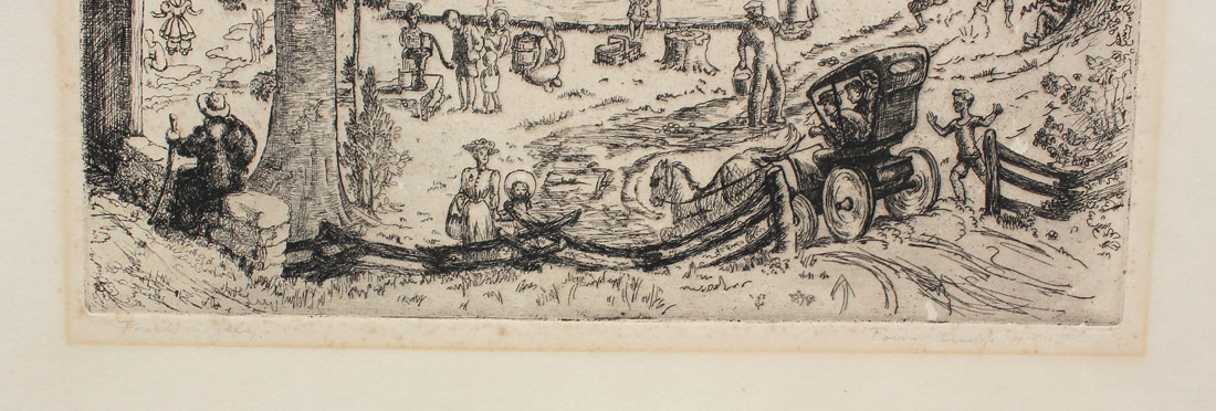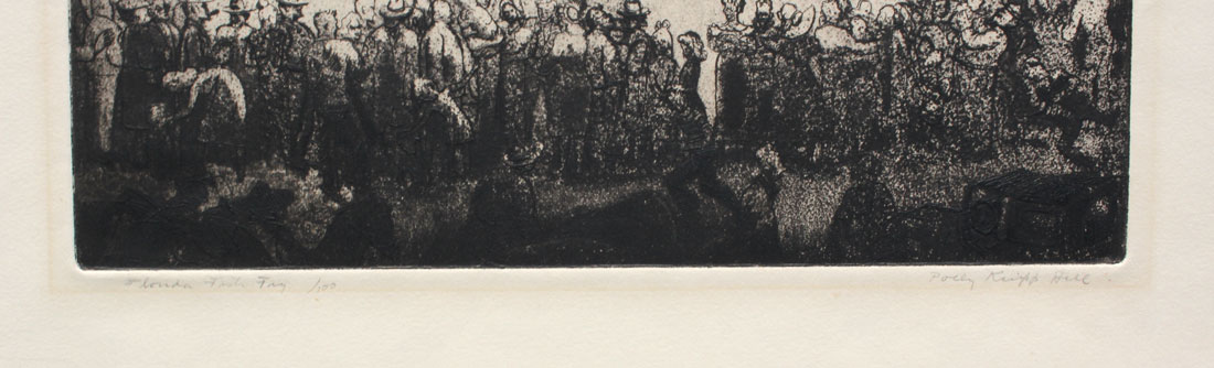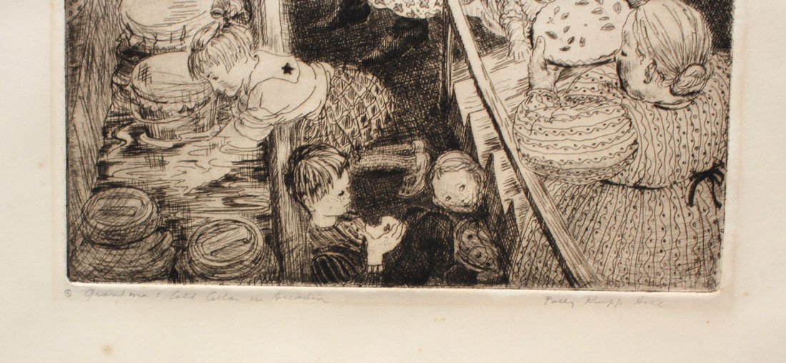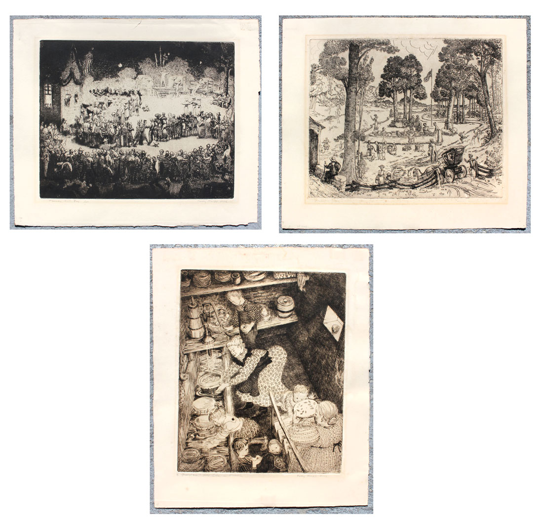 HILL, Polly (Pauline) Knipp, (American, 1900-1990): 3 Etchings, 1) ''Grandma's Cold Cellar in Arcadia'', 11.50'' x 13.50'', pencil signed lower right and titled lower left. 2) ''Florida Fish Fry'', edition of 100, pencil signed lower right and titled lower left, 11.50'' x 13.50''. 3) ''Fourth of July'', pencil signed lower right and titled lower left, first proof impression, 11.50'' x 13.50''.
