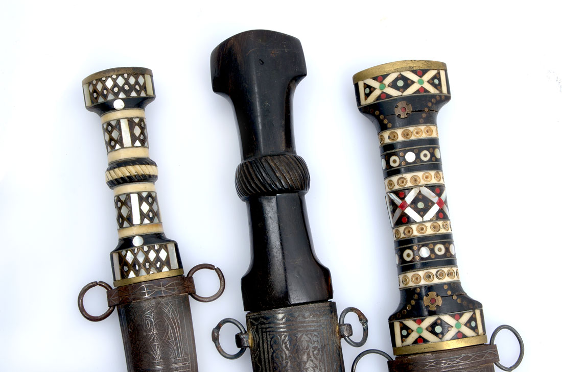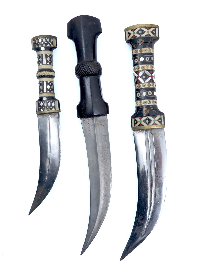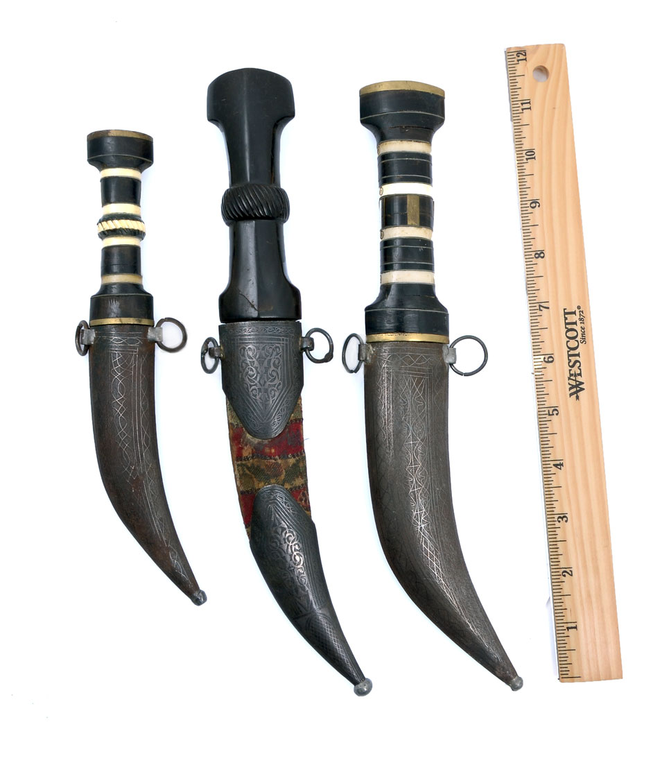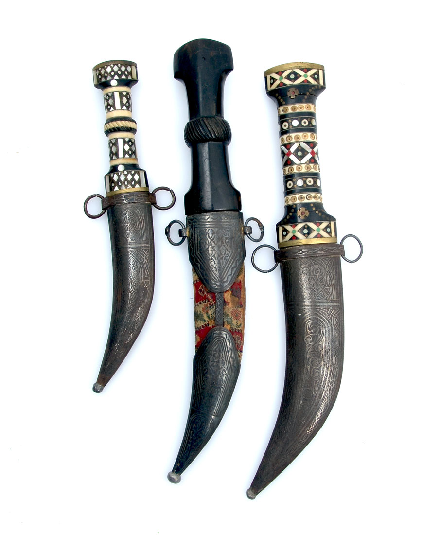 3 INLAID SYRIAN KHANJAR DAGGERS: 2 daggers have extensively inlaid hilts with forged steel curled blades and silver inlaid sheaths with ornate traditional design. The third dagger has a hilt made of horn with a forged curved steel blade with 2 silver inlaid section separated by a hand stitched red and tan floral motif sheath. All 3 sheaths have a wood interior. Largest Approx. 12.25'' l x 1.75'' w.