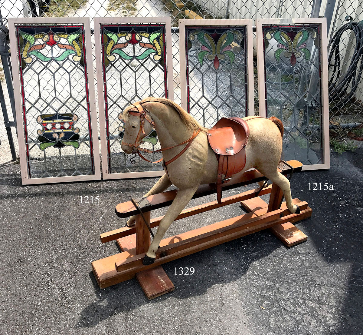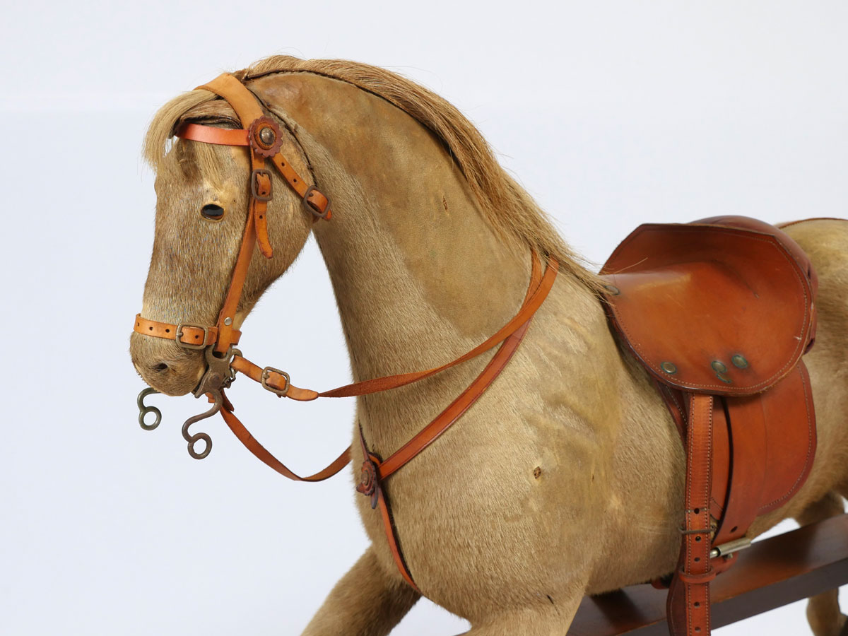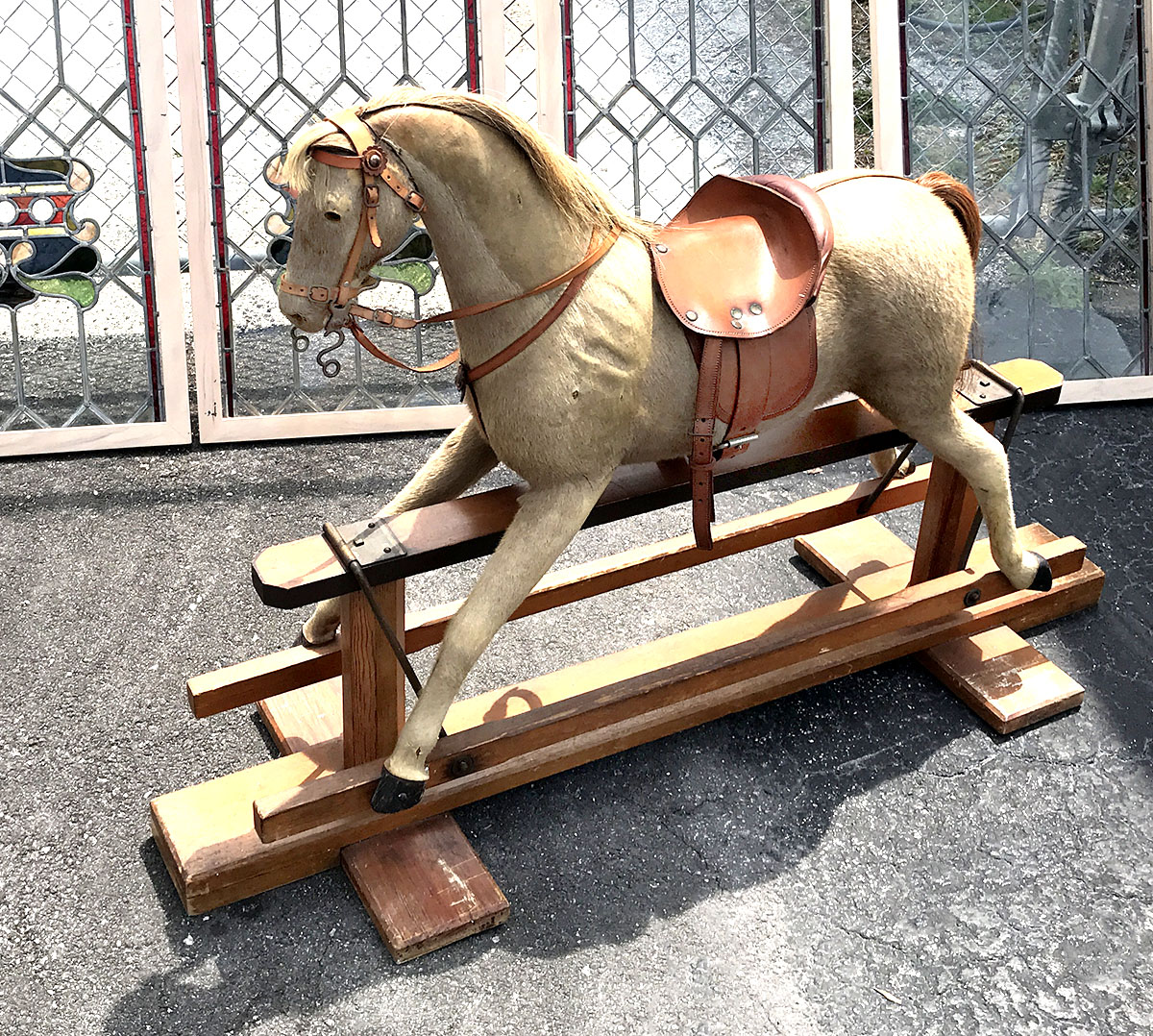 HORSE HAIR ROCKING GLIDER HORSE: This less common child's rocking glider horse was made using real horse hair, a leather saddle, reign, and metal bit. Mounted by wooden hooves to the rocking frame and 2 center octagonal supports attaching to wooden planked base. Approx. 36'' h x 54'' l x 18'' w.
