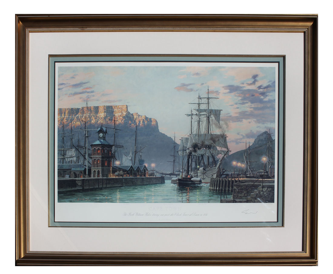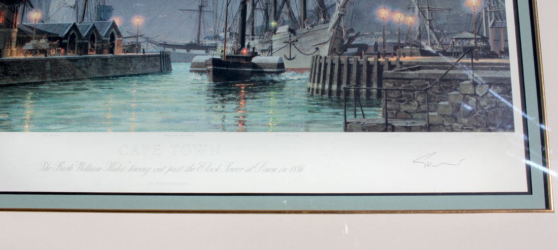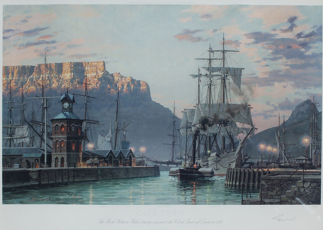 STOBART, John, (American, 1929- ): Cape Town, the Bark William Hales Towing Out Past the Clock Tower at Dawn in 1886, Lithograph, sight size is 23'' x 32.50'', pencil signed lower right, numbered 208 of 950, framed 35.50'' x 43.50''.