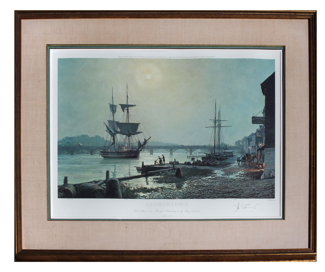 STOBART, John, (American, 1929- ): Georgetown Water Street 1845 Passengers Embarking in the Brig ''Edward'', Lithograph, sight size is 21'' x 29.50'', pencil signed lower right and numbered 378 of 750, framed 32'' x 40''.