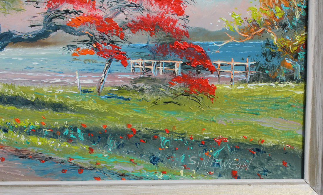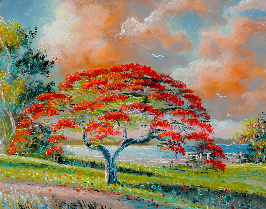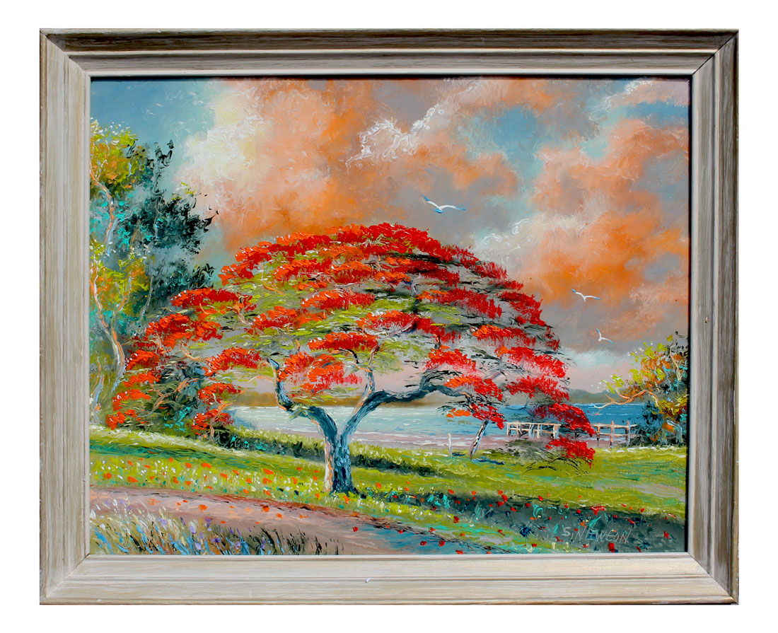 NEWTON, Sam, (American, 1948- ): ''Poinciana Tree'', Oil/Masonite, sight size is 16'' x 20'', signed lower right, framed 18.50'' x 23''.