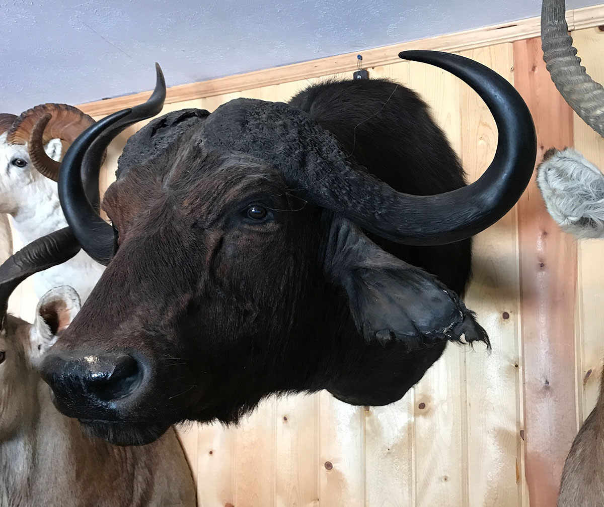 AFRICAN CAPE BUFFALO SHOULDER MOUNT: This large and rare well preserved specimen would be a highly sought after mount due to the fact that the bosses meet in the center. Approx measurements 39.5'' l x 40'' w x 34'' h.