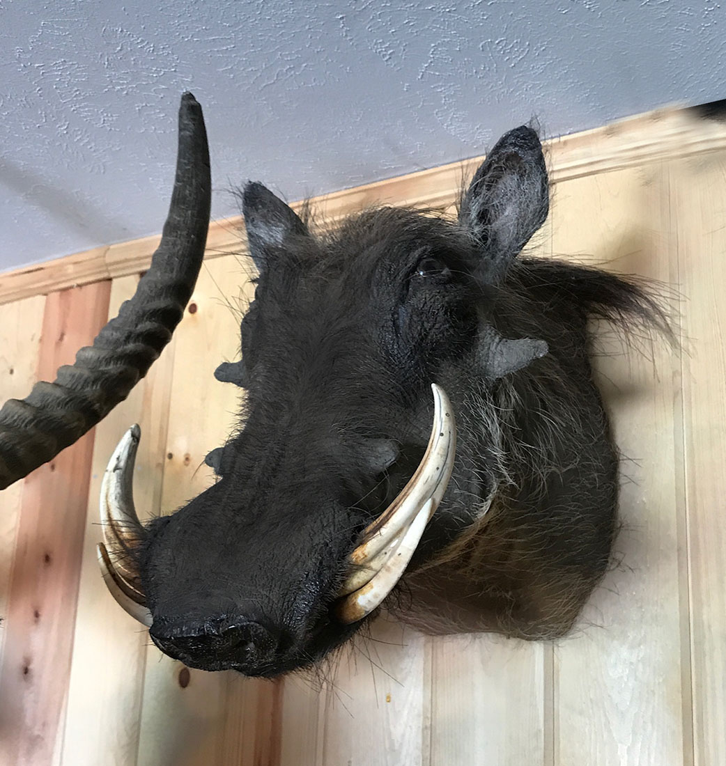 AFRICAN BLACK WARTHOG SHOULDER MOUNT WITH TUSKS: The warthog is quite speedy and is often seen praying or rooting for food. A fine specimen indeed! Approx measurements 17'' l x 11'' w x 19'' h.