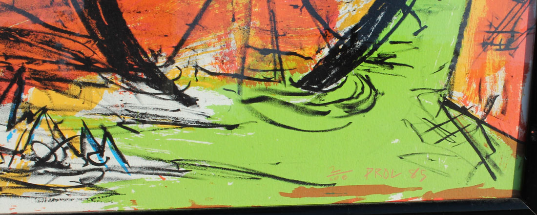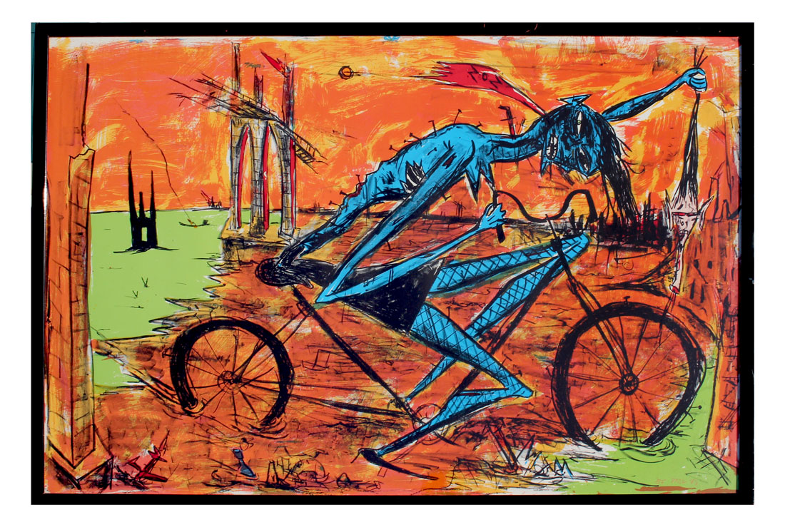 PROL, Rick, (American, 1958): Blue Demon Like Figure Riding a Bike Holding a Head in a Surreal Landscape, Lithograph, sight size is 31'' x 44'', signed lower right and numbered 2 of 100 and dated '85, framed 32.50'' x 46''.
