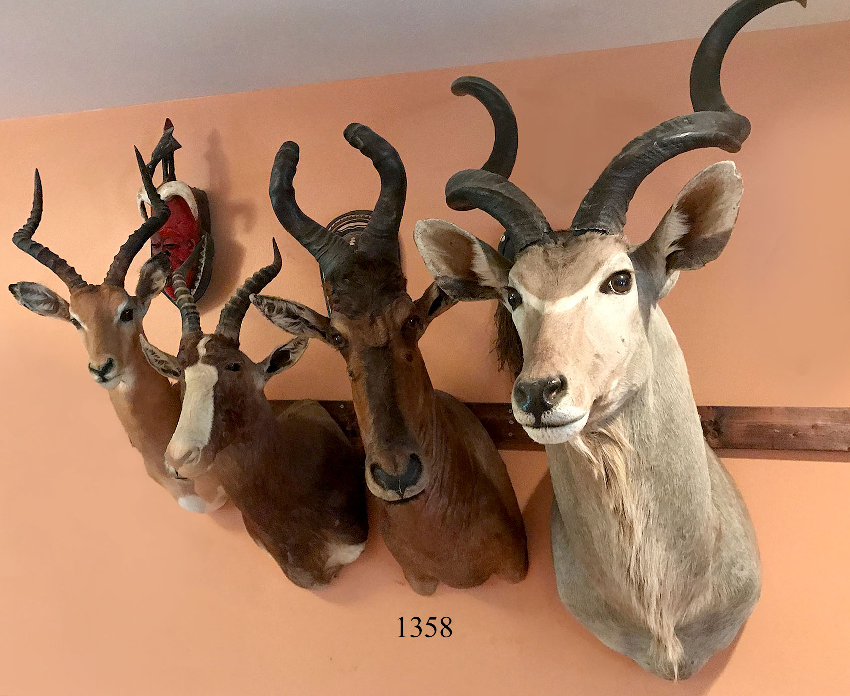 SOUTH AFRICAN HARTEBEAST TROPHY MOUNT: The Hartebeest, is a large African antelope with an elongated head, unusual bracket-shaped horns, and high forequarters sloping to lower hindquarters-a trait of the tribe Alcelaphini, which also includes wildebeests and the blesbok. Approx measurements 25'' l x 17'' w x 39'' h.