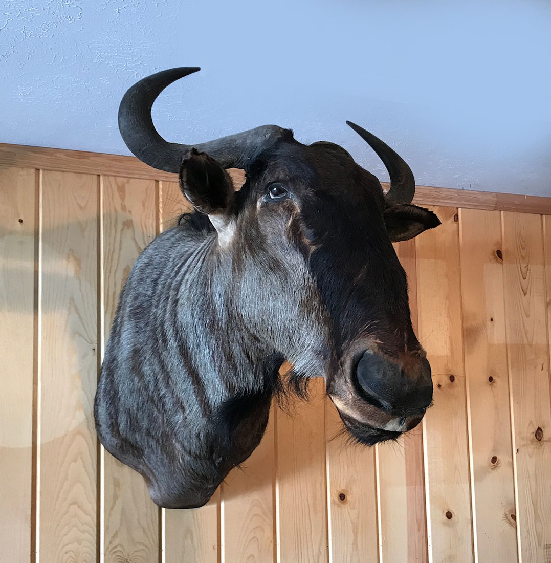 WILDEBEEST TROPHY SHOULDER MOUNT: Excellent specimen. Approx measurements 32'' l x 2'' w x 28'' h.