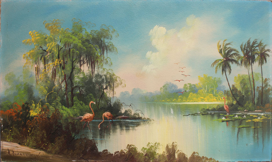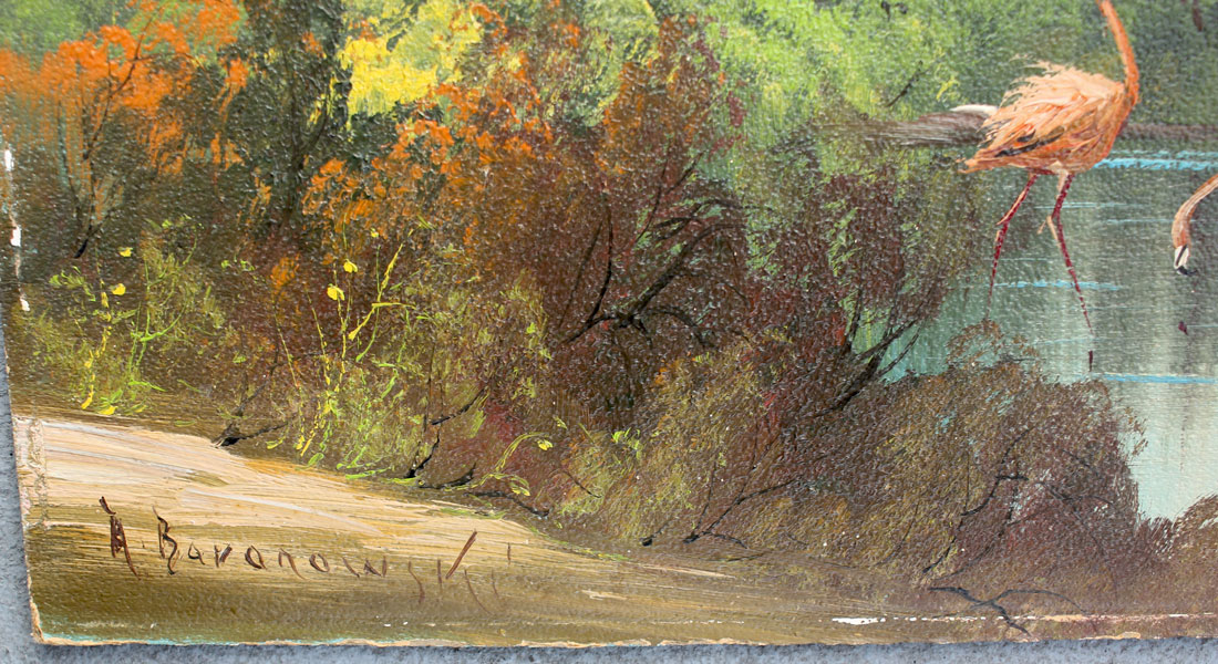 BARANOWSKI, Alexander, (American, 1920-1981): Florida River Scene with Flamingos, Oil/Board, 18'' x 30'', signed lower left, unframed.