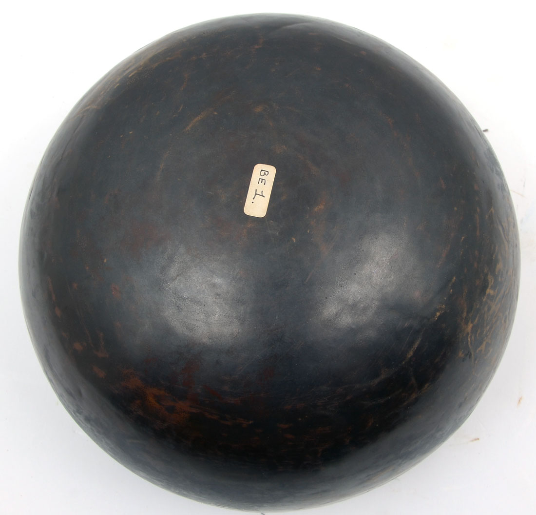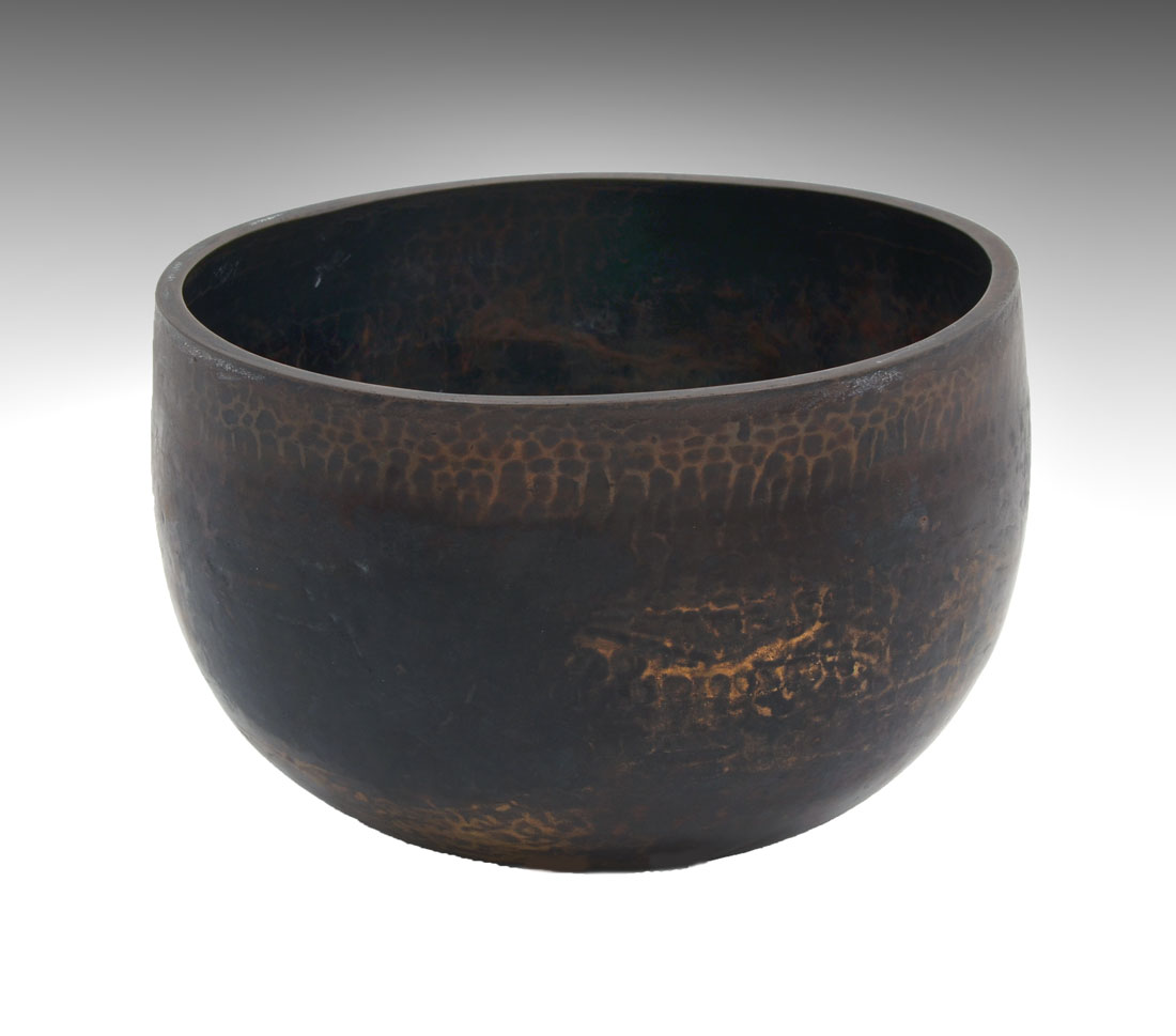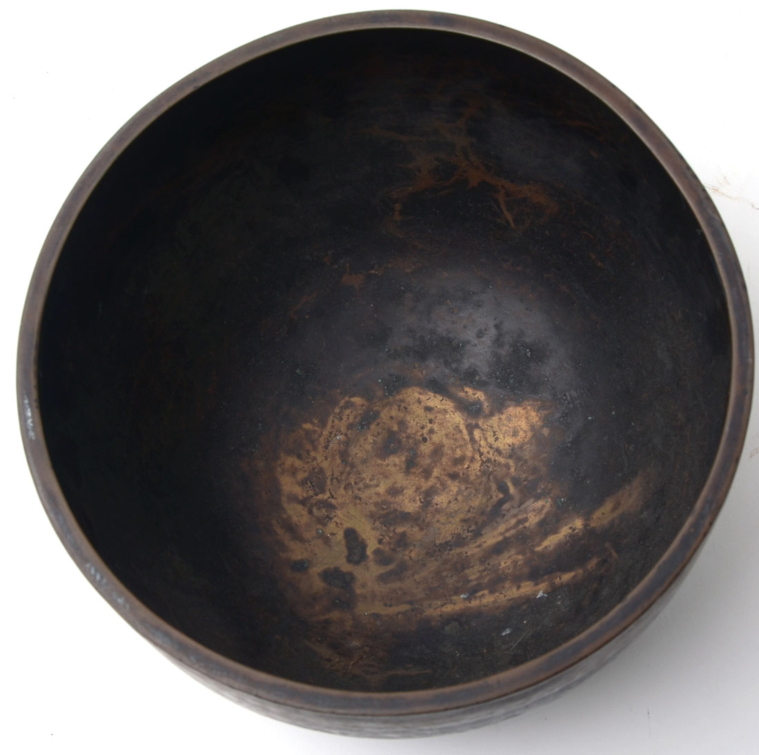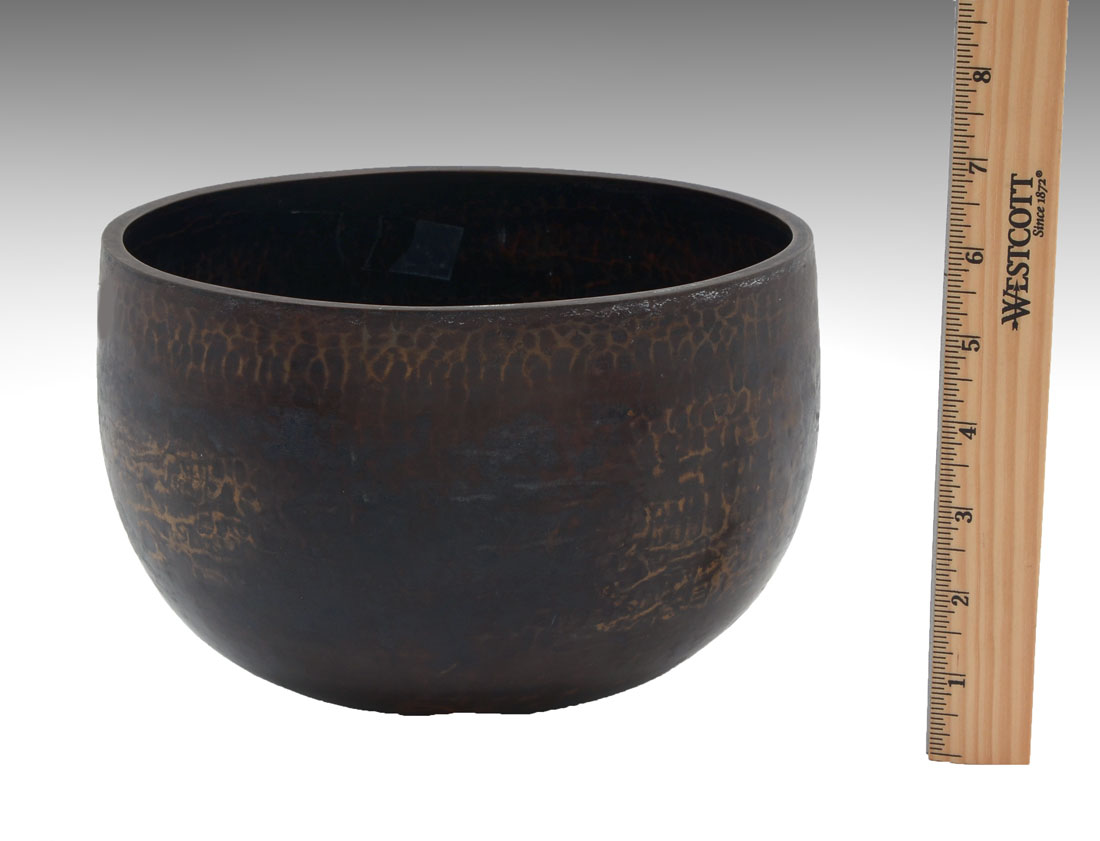 BRONZE TEMPLE BOWL: Old hand hammered bronze temple gong bowl, which resonates when struck. Round bottom with steep sides. Approx. 5.75'' h x 8.75'' w.