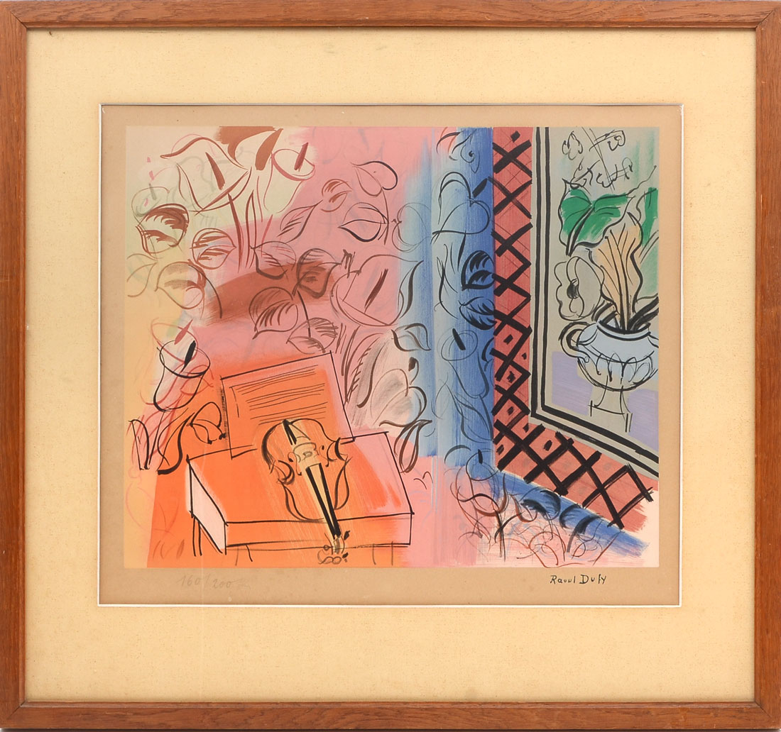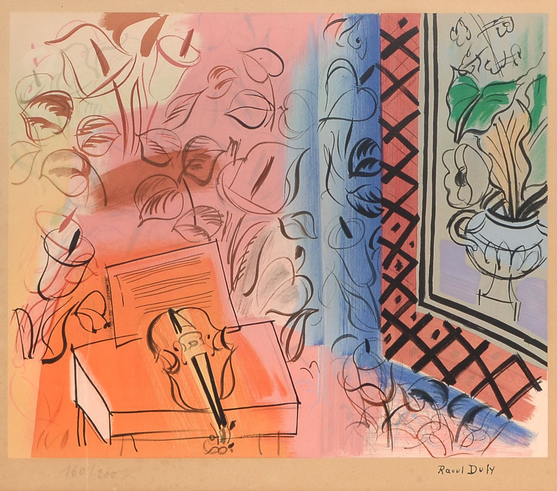 DUFY, Raoul, (French, 1877-1953): Interior Scene with Violin, Lithograph, sight size is 17.25'' x 20'', signed in the plate lower right and numbered 160 of 200 lower left, framed 25.50'' x 27.50''.