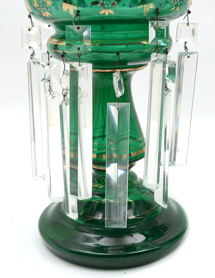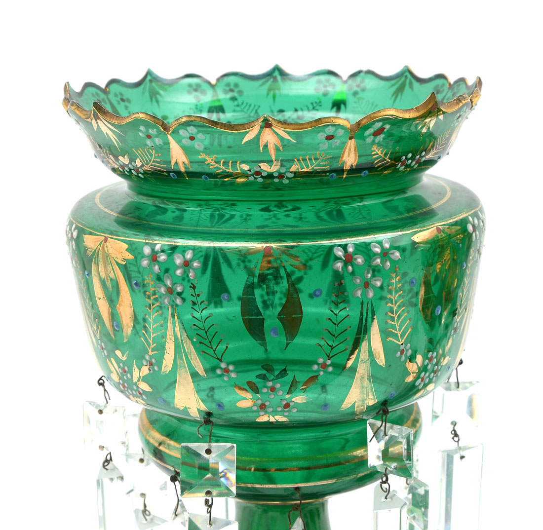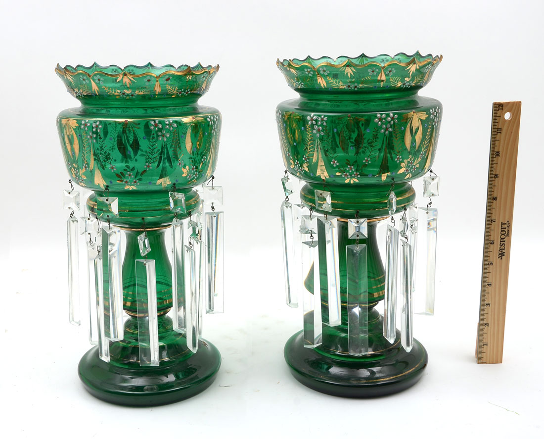 PAIR OF GREEN BOHEMIAN MANTLE LUSTERS: These green Bohemian mantle lusters have been hand painted with gold accenting and white enamel flowers. There are 14 Prisms attached to each. 14.25'' h x 7'' w.