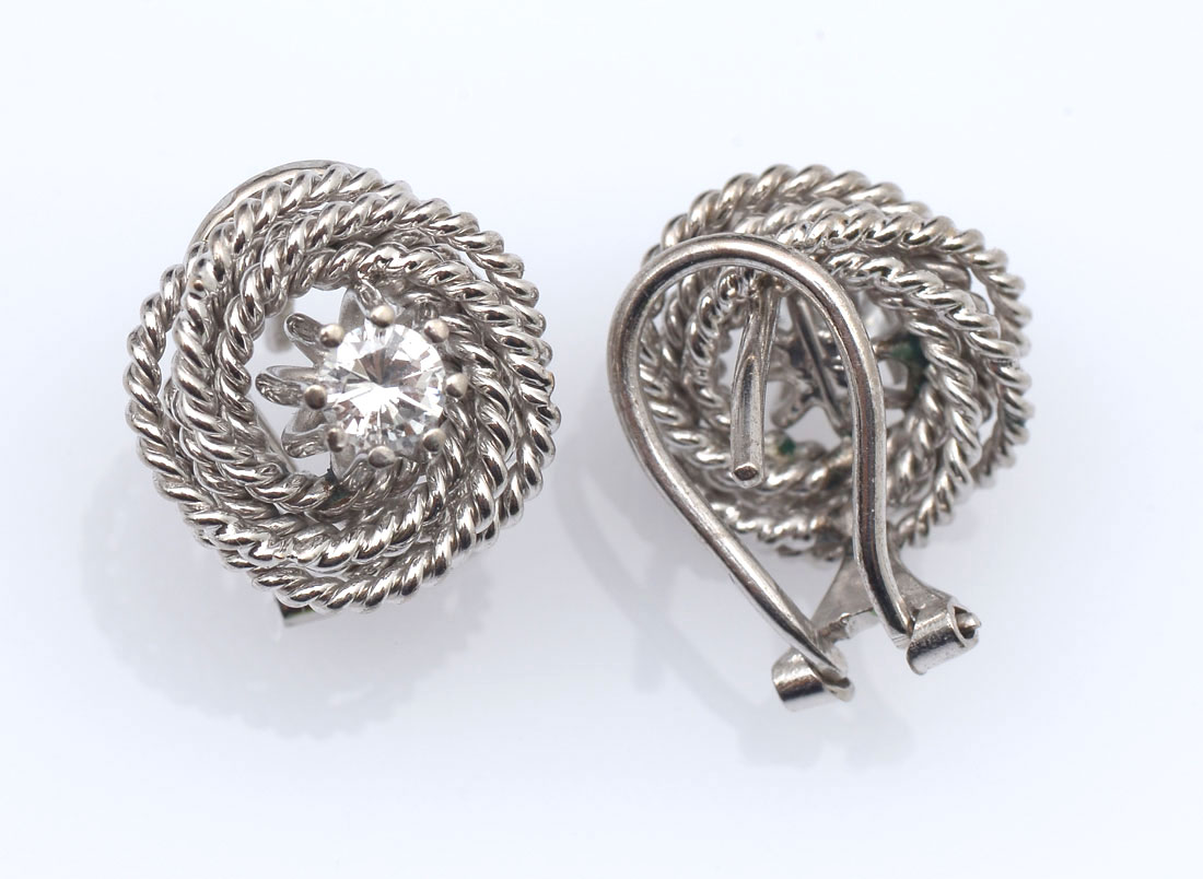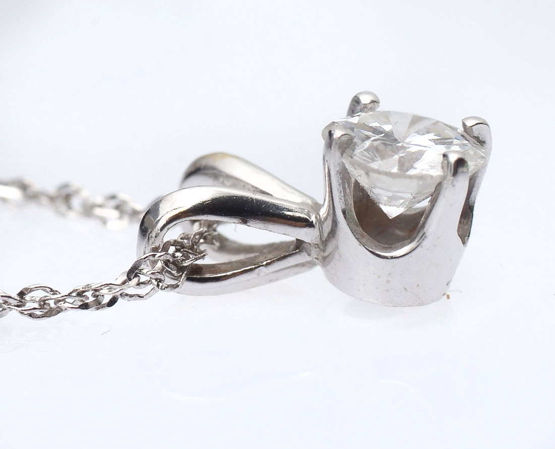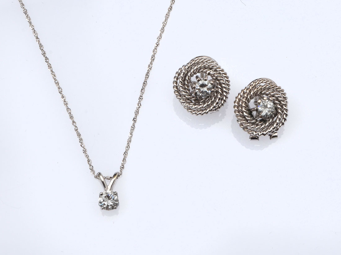 14K 1.00 CTW DIAMOND EARRINGS & NECKLACE: 14K white gold earrings and solitaire pendant contains 3 round full cut diamonds. WEIGHT: 1.00 Ct. Approx. Rated VS in clarity and G-H in color. The diamonds are prong set. Post and hinged clip earrings. 18'' fine rope chain. Weight: 9.5 grams