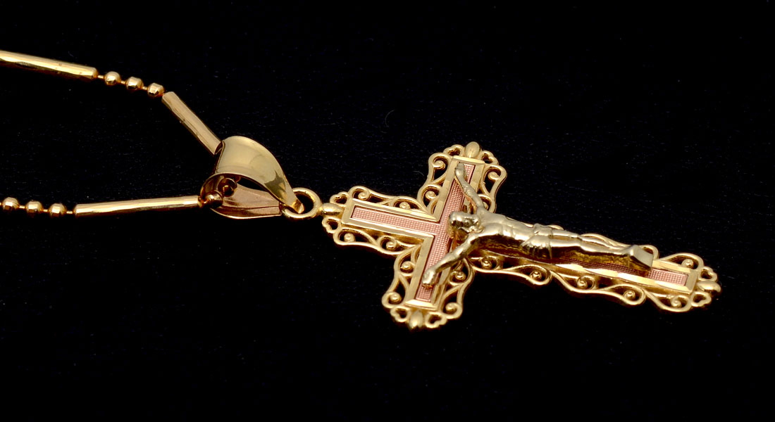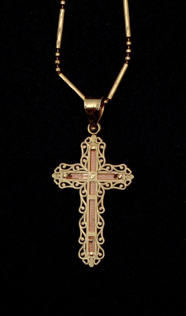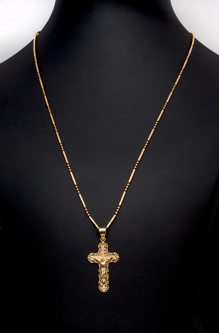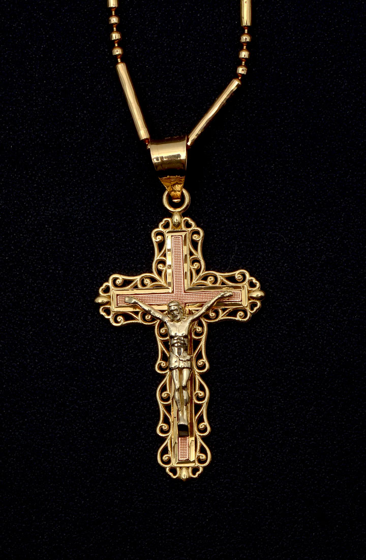 14K CROSS PENDANT & CHAIN: 14K yellow gold crucifix/cross pendant with 20'' fancy link chain. Weight: 7.7 grams.