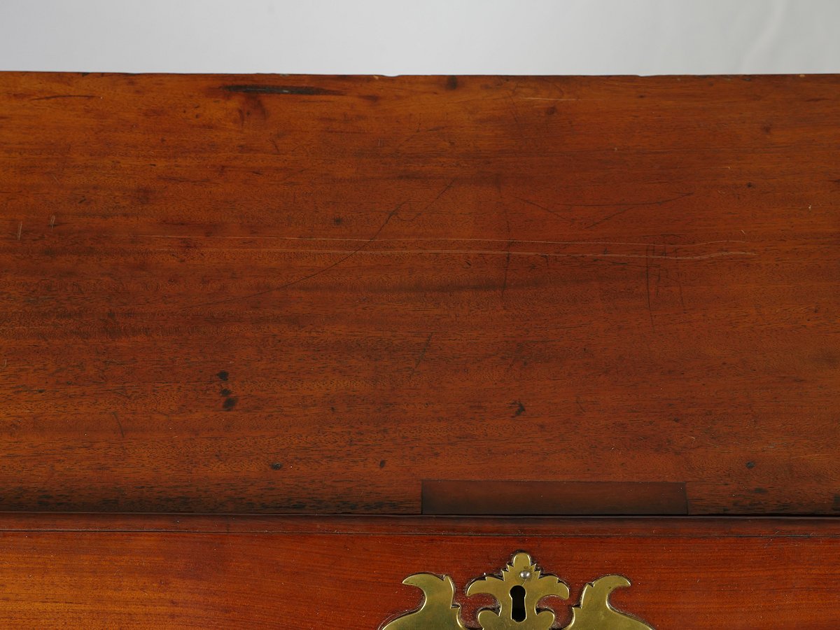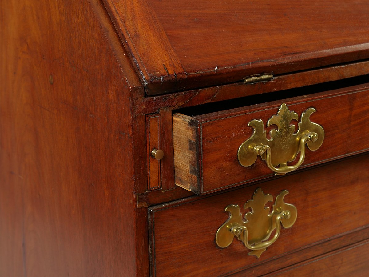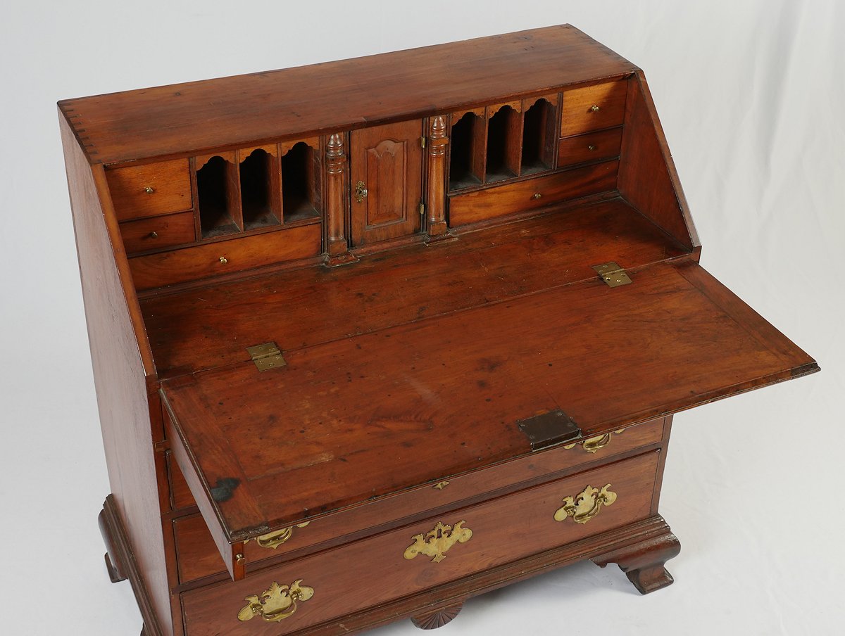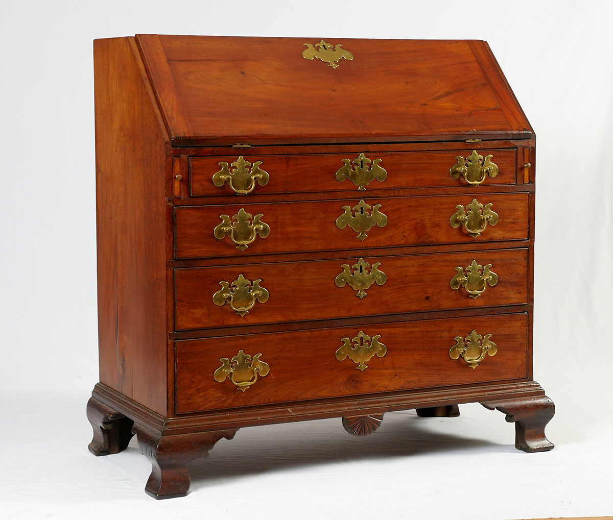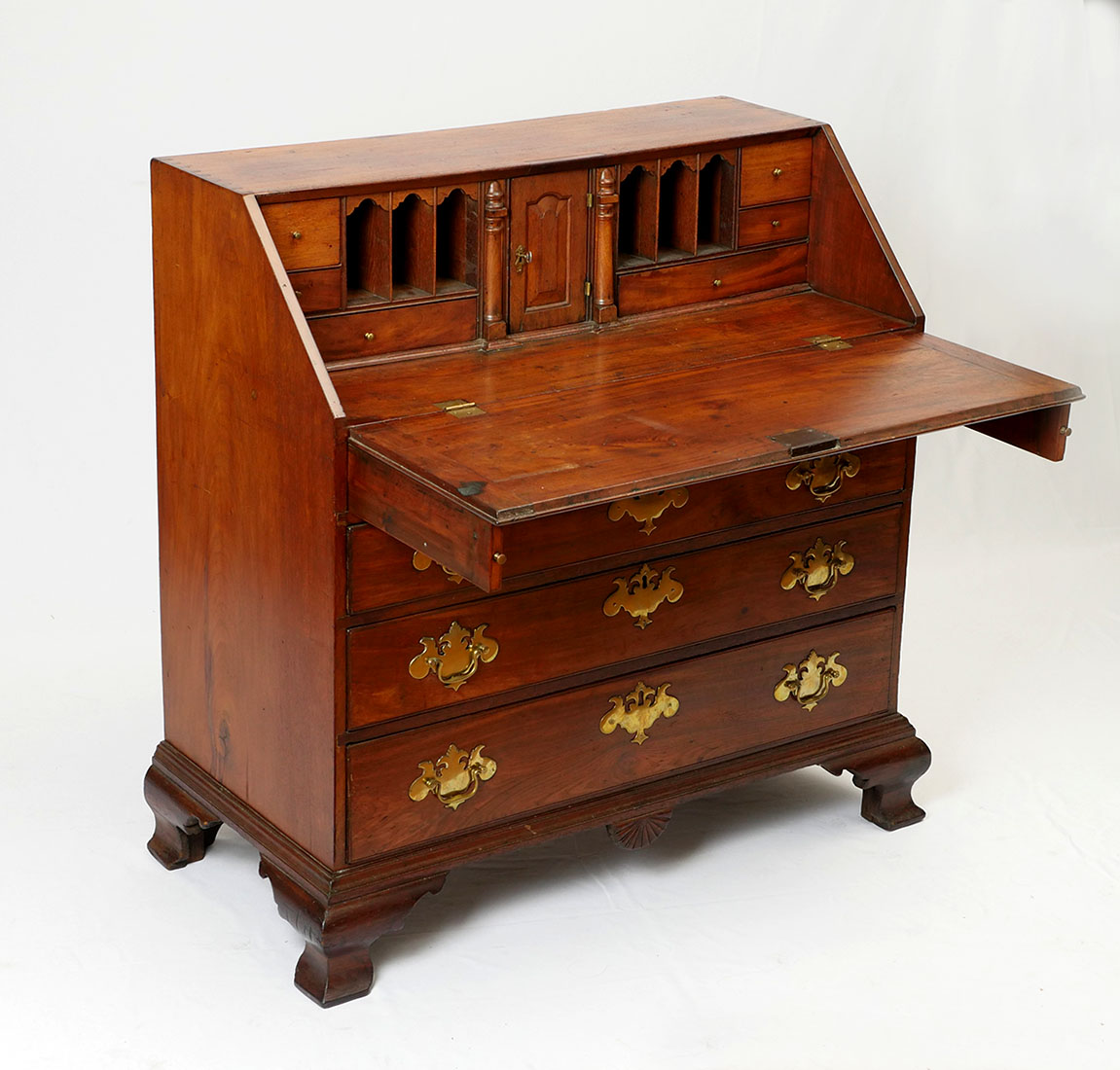 18TH CENTURY CHIPPENDALE SLANT FRONT SECRETARY: Period Chippendale slanted drop-front secretary. Drop front is supported by 2 pulls. Multi-drawer and pigeon hole interior with hidden drawer behind top side of locking door. Brass bail handles complement the facade. Dovetailed joints and ogee bracket formed feet. Approx. 42'' h x 40'' l x 22'' w.
