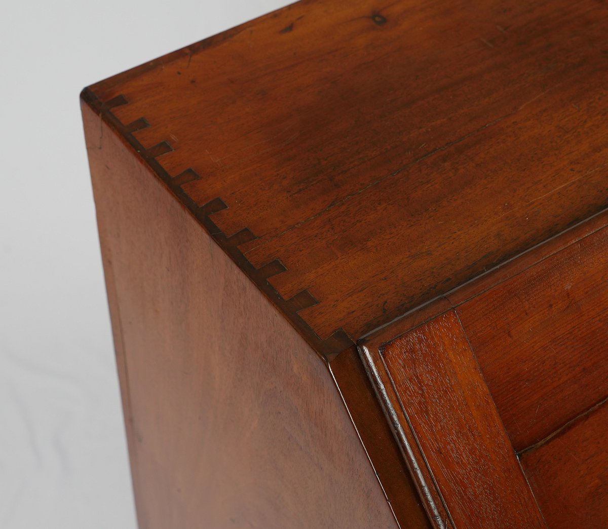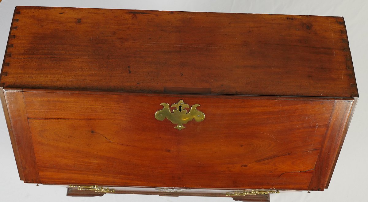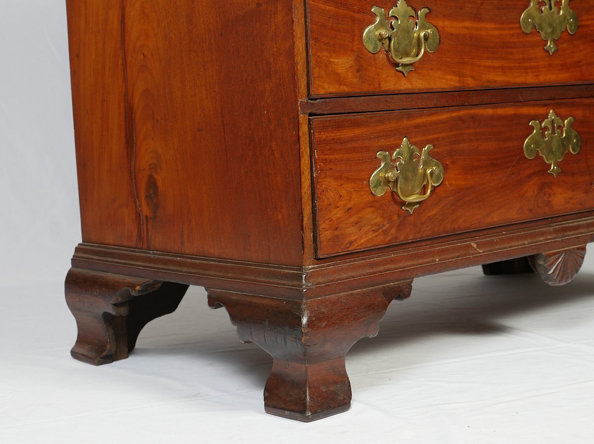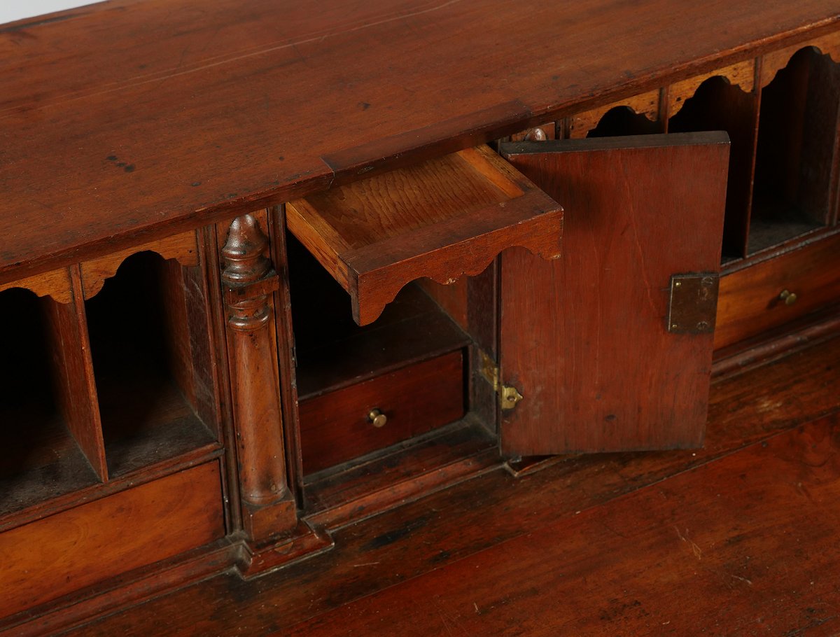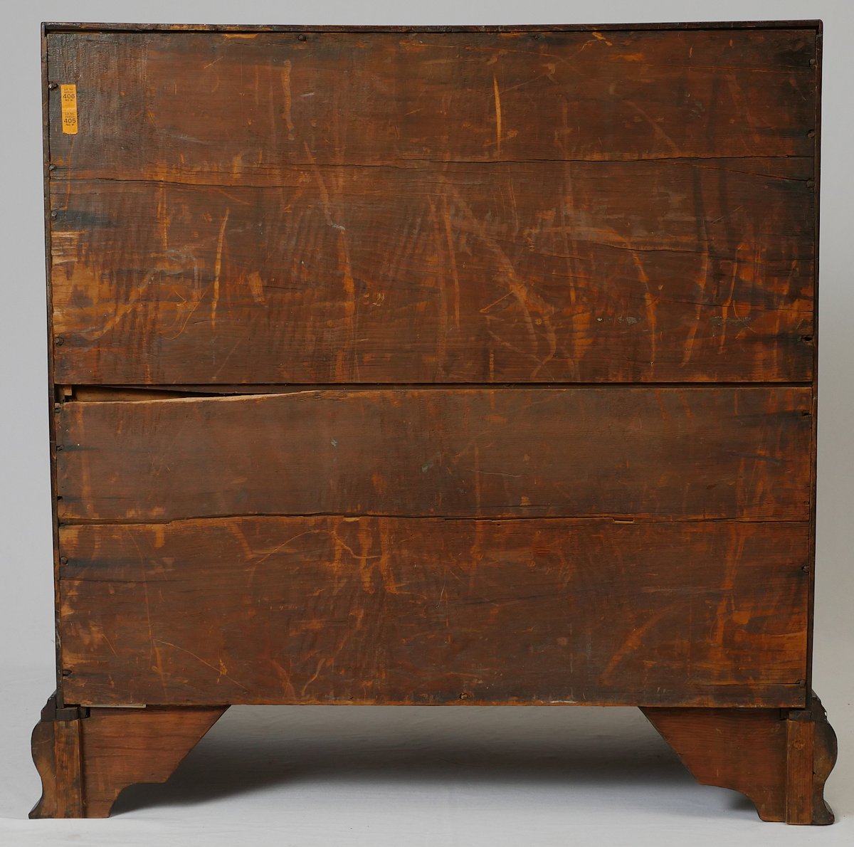 18TH CENTURY CHIPPENDALE SLANT FRONT SECRETARY: Period Chippendale slanted drop-front secretary. Drop front is supported by 2 pulls. Multi-drawer and pigeon hole interior with hidden drawer behind top side of locking door. Brass bail handles complement the facade. Dovetailed joints and ogee bracket formed feet. Approx. 42'' h x 40'' l x 22'' w.