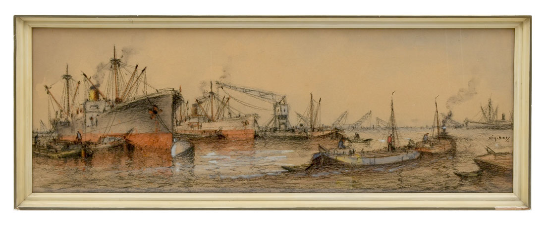 ELABORATE ILLEGIBLY SIGNED INDUSTRIAL HARBOR SCENE DRAWING: Sight size is 10'' x 27.50'', signed in the right margin, framed 11.50'' x 30''.