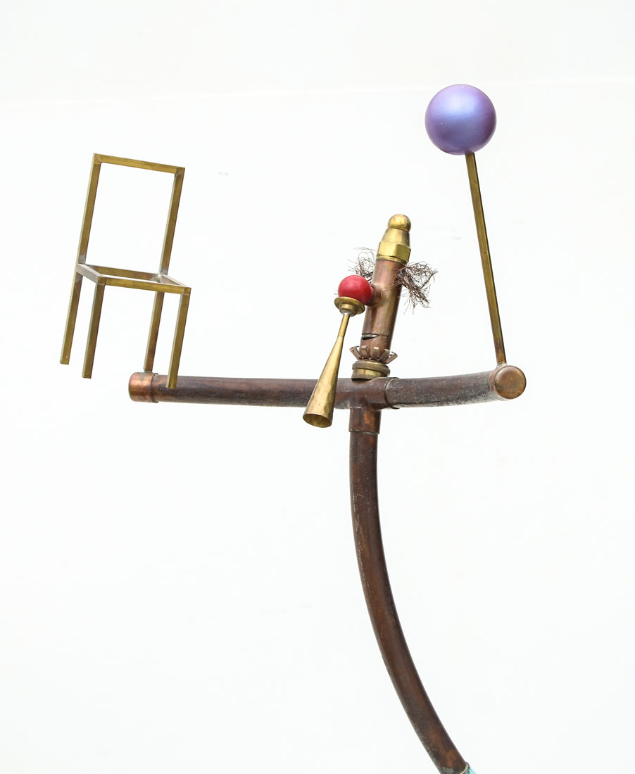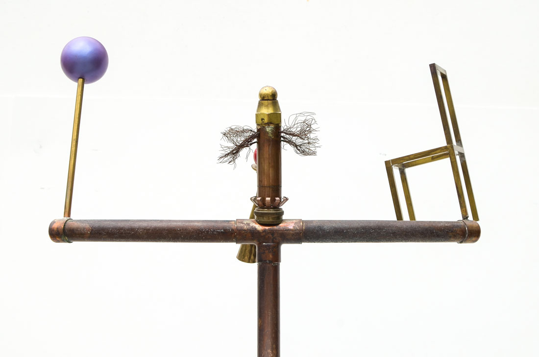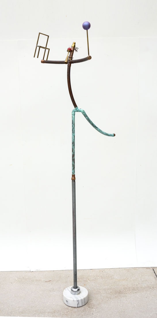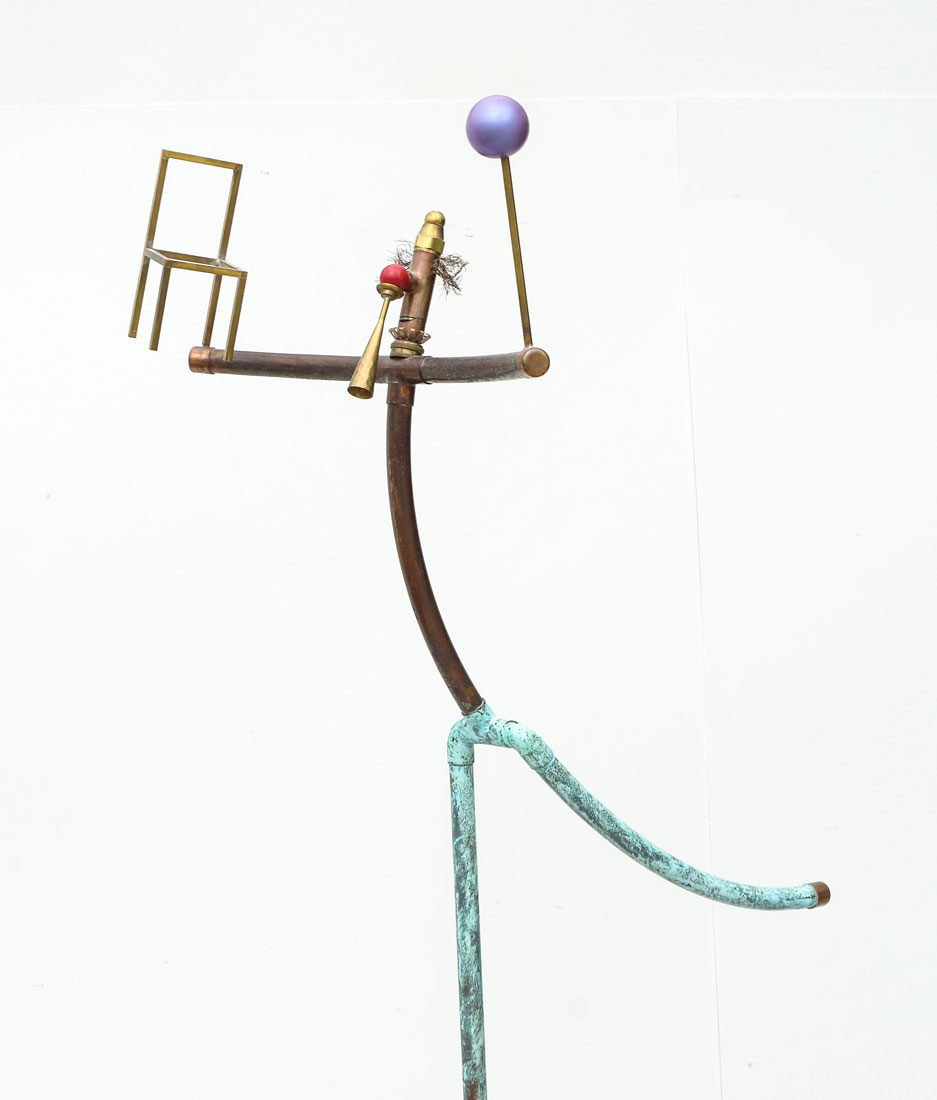 LARGE MIXED MEDIA CLOWN JUGGLER SCULPTURE: Copper and metal piping with brass and other materials.