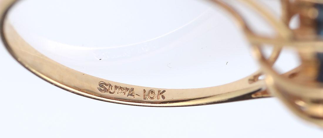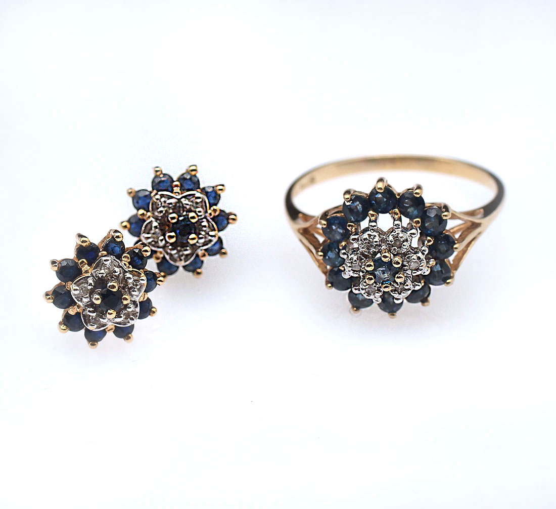10K SAPPHIRE & DIAMOND EARRINGS & RING: 10K yellow gold earrings and ring contains 16 round single cut diamonds. WEIGHT: .10 Ct. Approx. Rated I1 in clarity and I-J in color. 32 round faceted blue sapphires. WEIGHT: 1.50 Ct. Approx. The diamonds and sapphires are prong set. Post and nut closures. Size: 6.5 Weight: 4.4 grams.