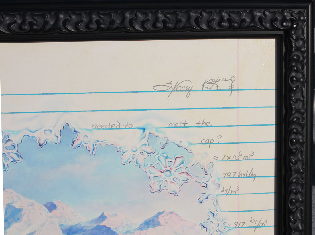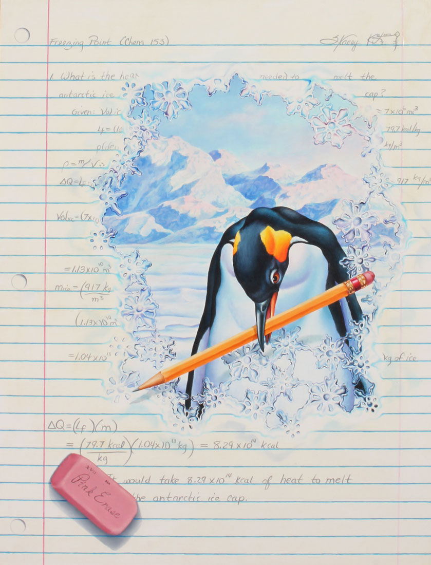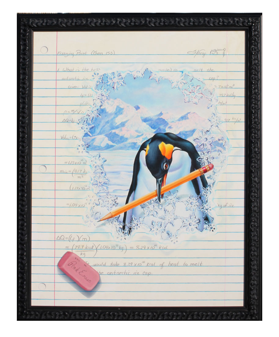 FREEZING POINT PAINTING S. KACEY: Trompe L'oeil Style Picture with Penguin, Oil/Masonite, sight size is 32.50'' x 25'', signed upper right and dated 2000, titled upper left, framed 37'' x 29.50''.