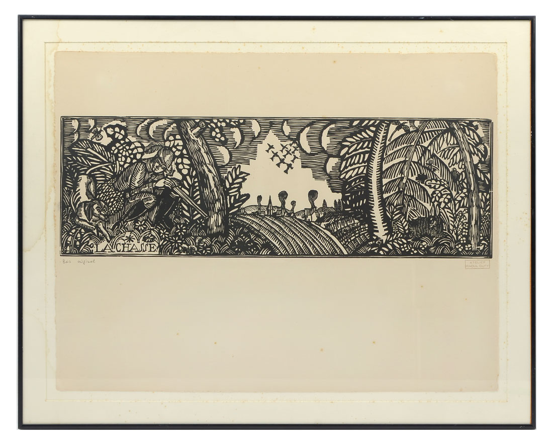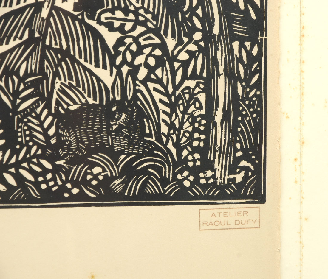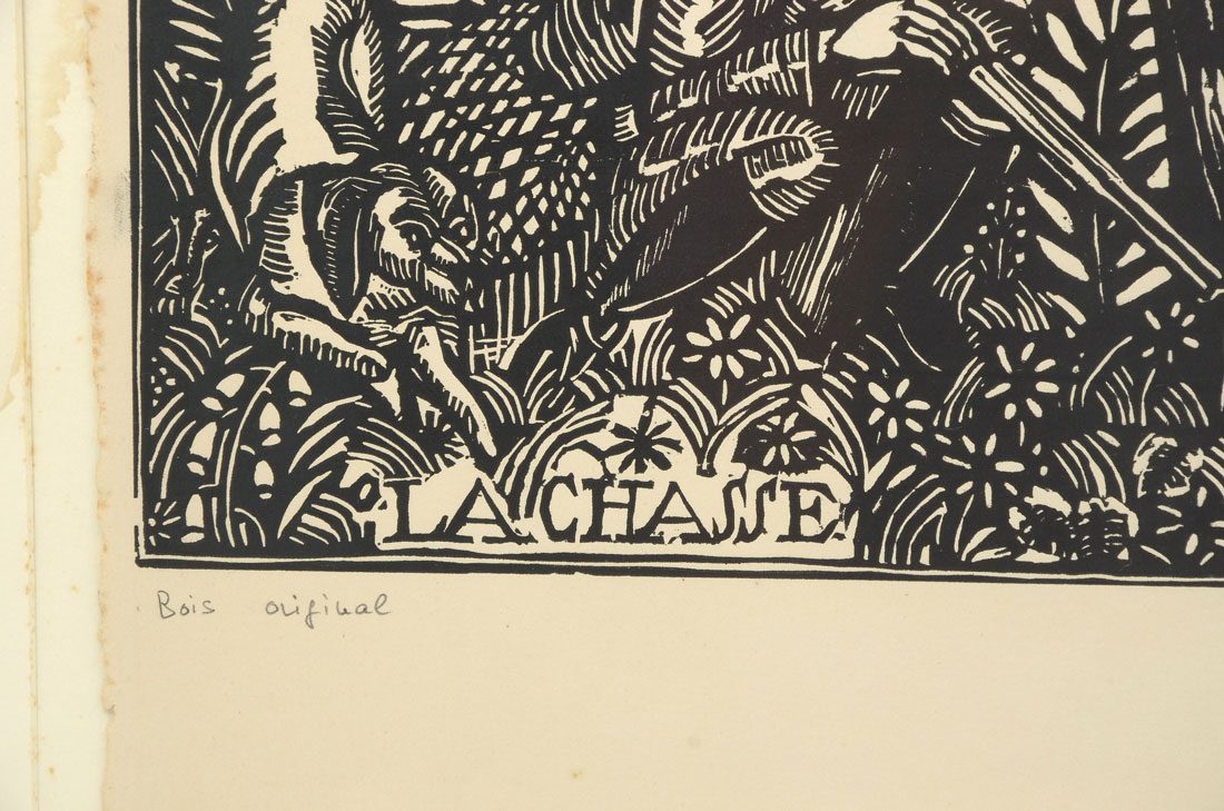 DUFY, Raoul, (French, 1877-1953): ''La Chasse'', Woodcut, 19.75'' x 25.75'', titled in the plate lower left, marked in pencil Bois Original, Atelier Raoul Dufy stamp lower right, framed 24.25'' x 30.25''.