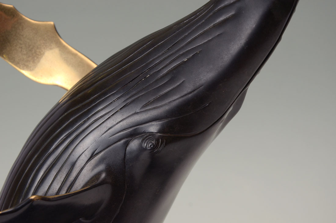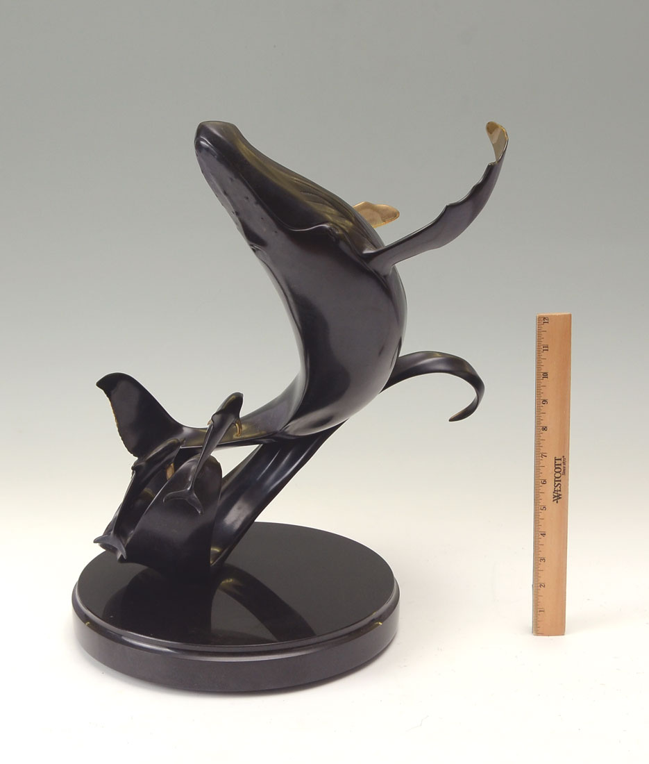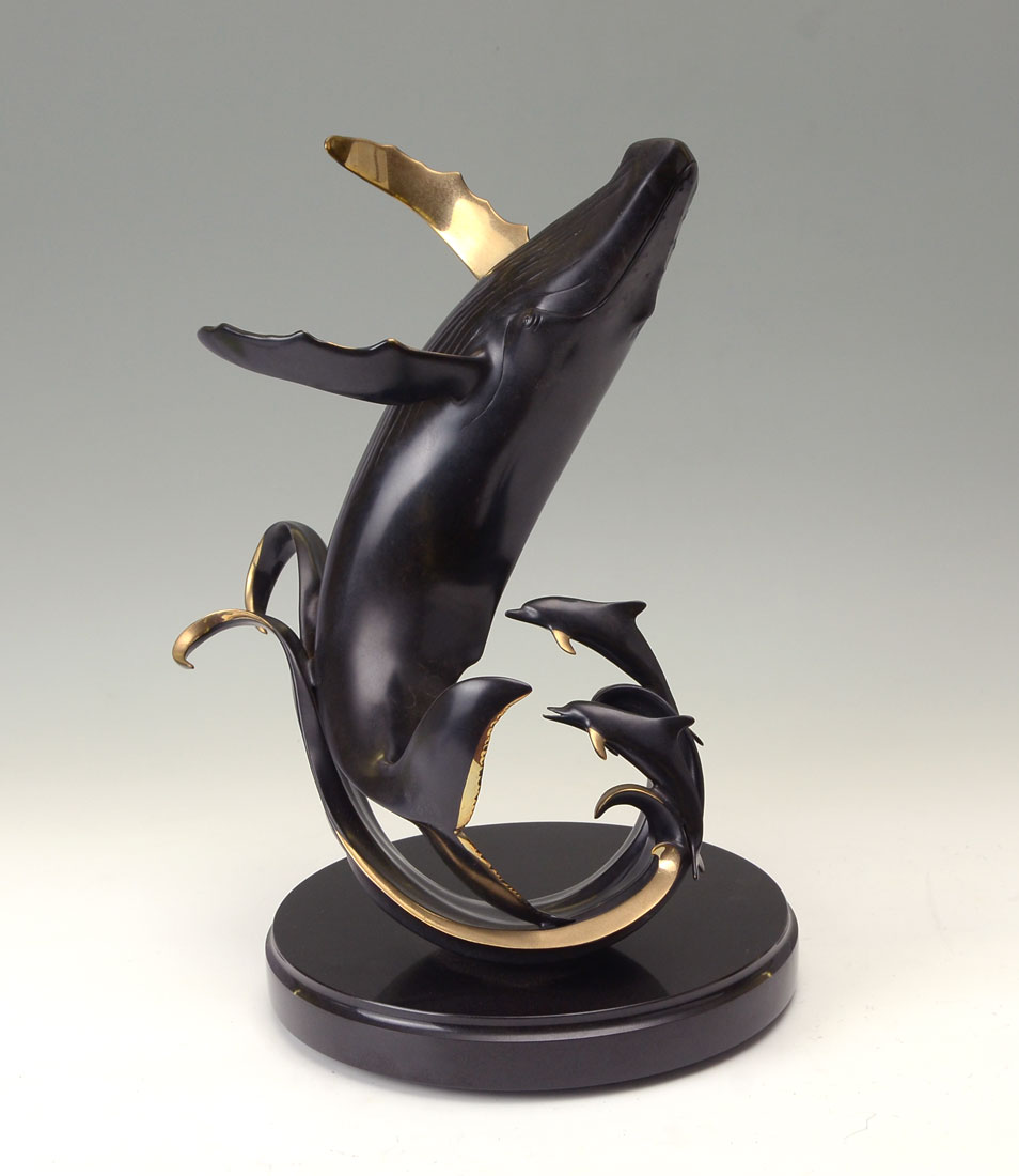 HANSON, Scott, (American, 20th C.): Humpback Whale in Dolphin Grouping, Patinated Bronze, 18'' in height, affixed to a rotating beveled marble plinth that is approximately 21'' overall, signed and numbered 133 of 150.