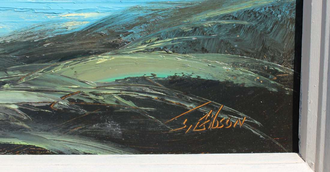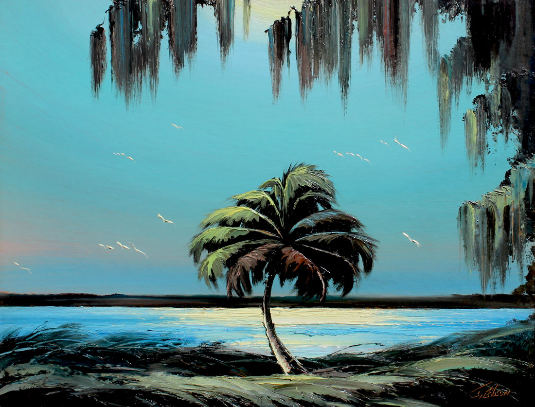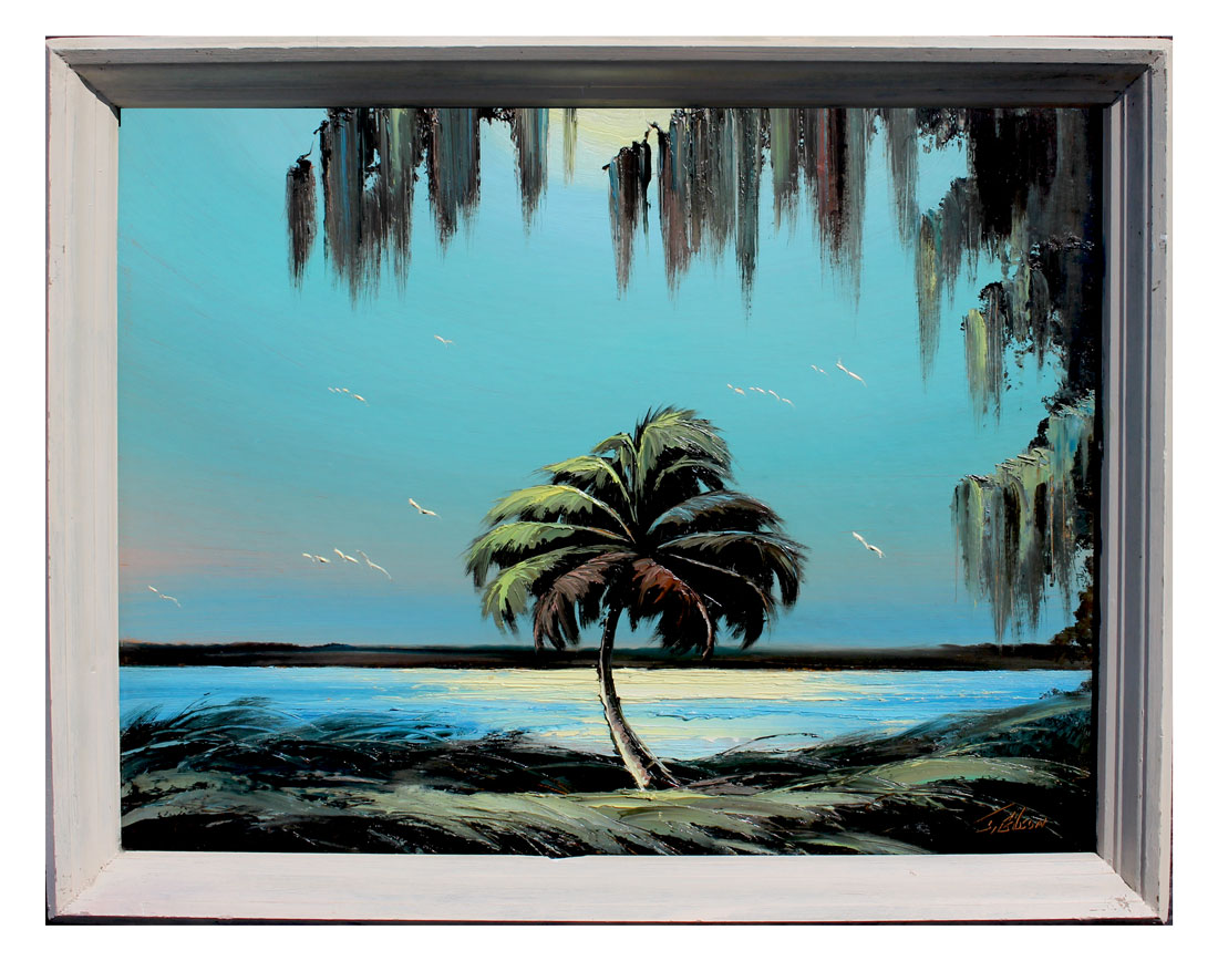 GIBSON, James, (American, 20th C.): Florida Highwaymen Landscape with Moonlit River Scene with Palm, Oil/Upson, 22.25'' x 29'', signed lower right, framed 24.50'' x 31''.