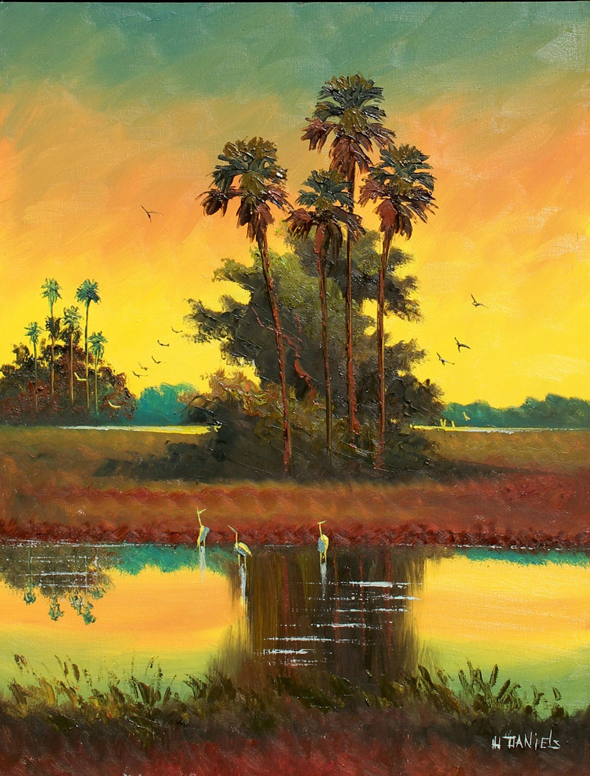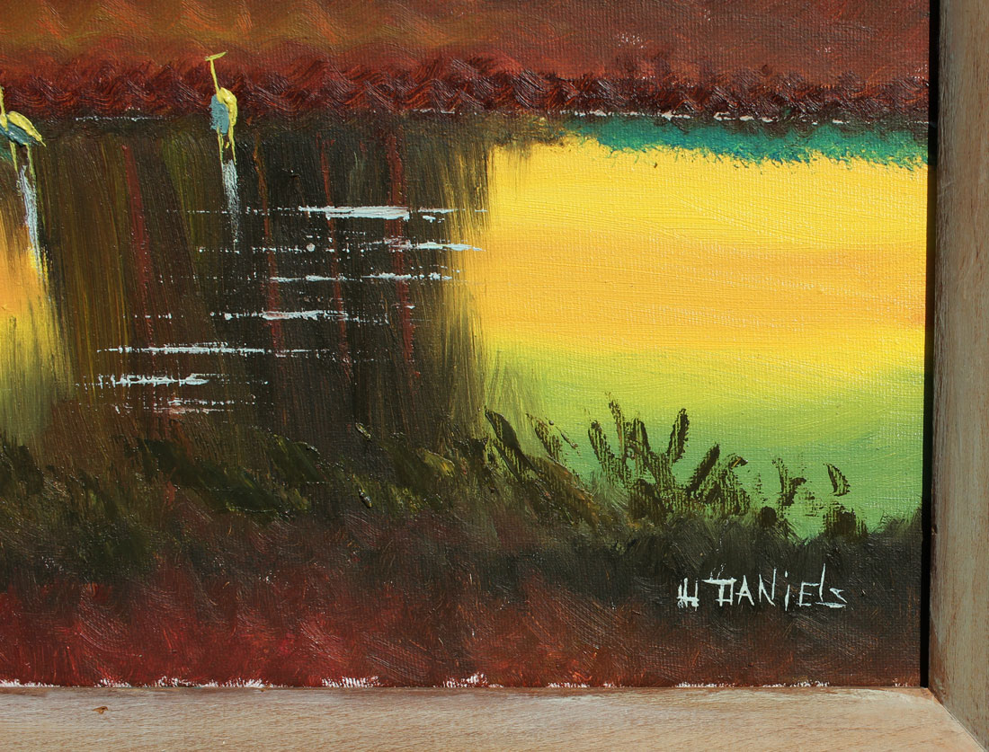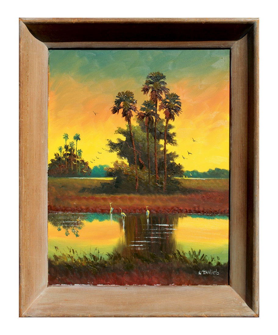 DANIELS, Willie (American, 20th C): Florida Highwaymen Scene with Herons and the Sunset Glow with Palms, Oil/Canvas, 20'' x 16'', signed lower right, framed, 24'' x 20''.