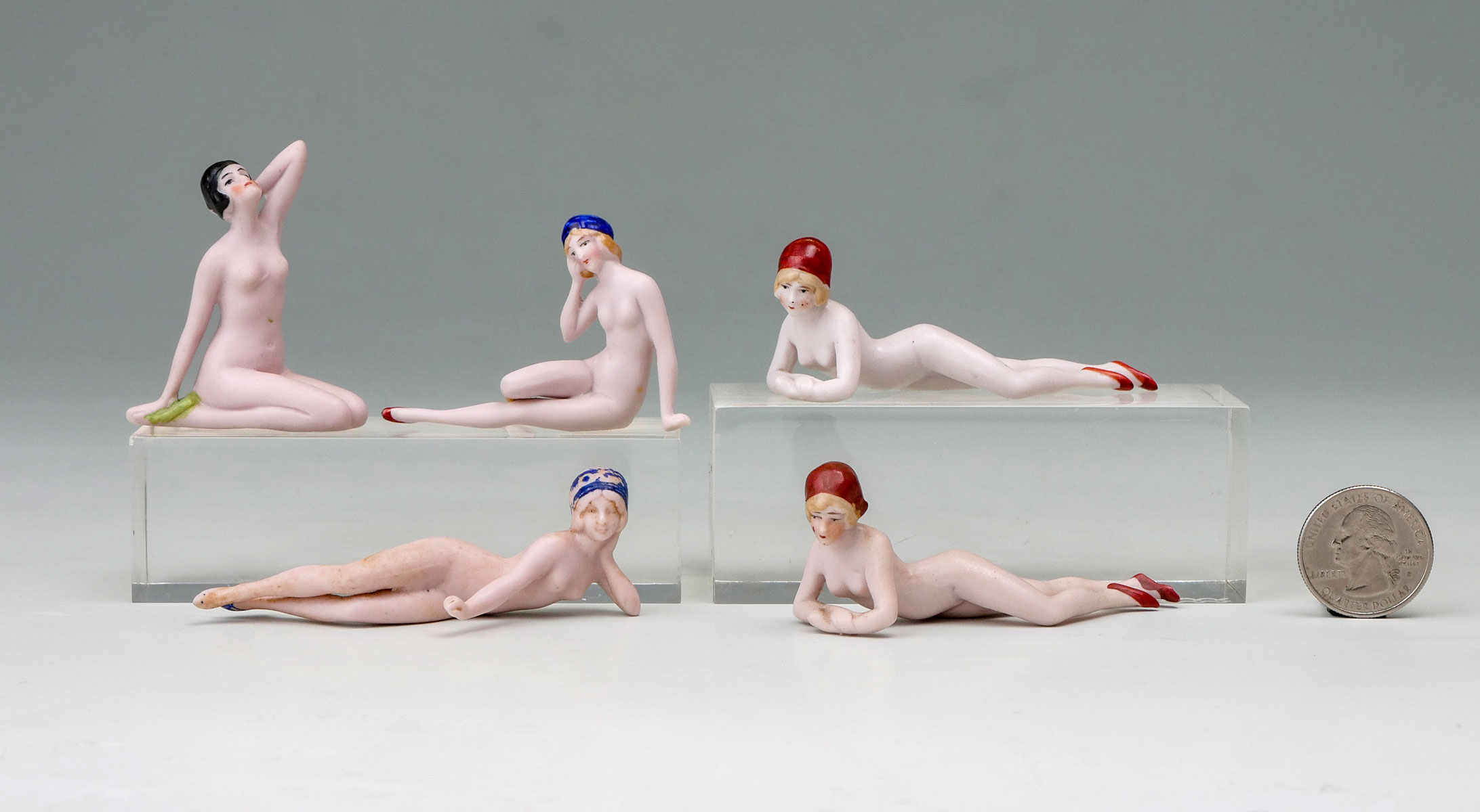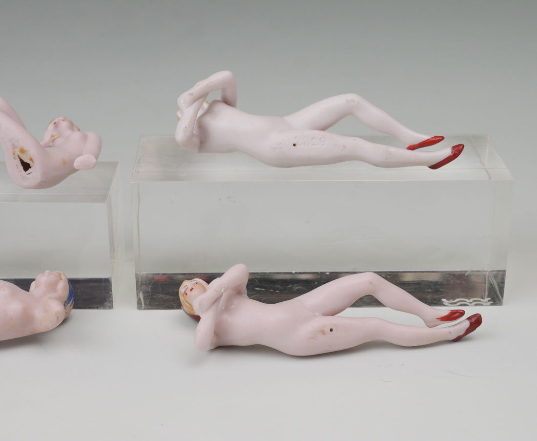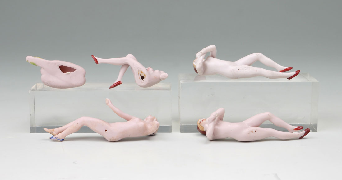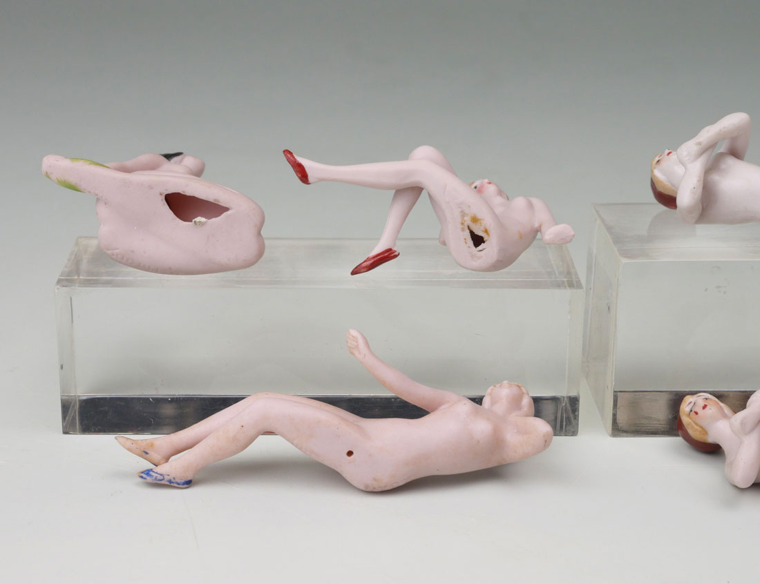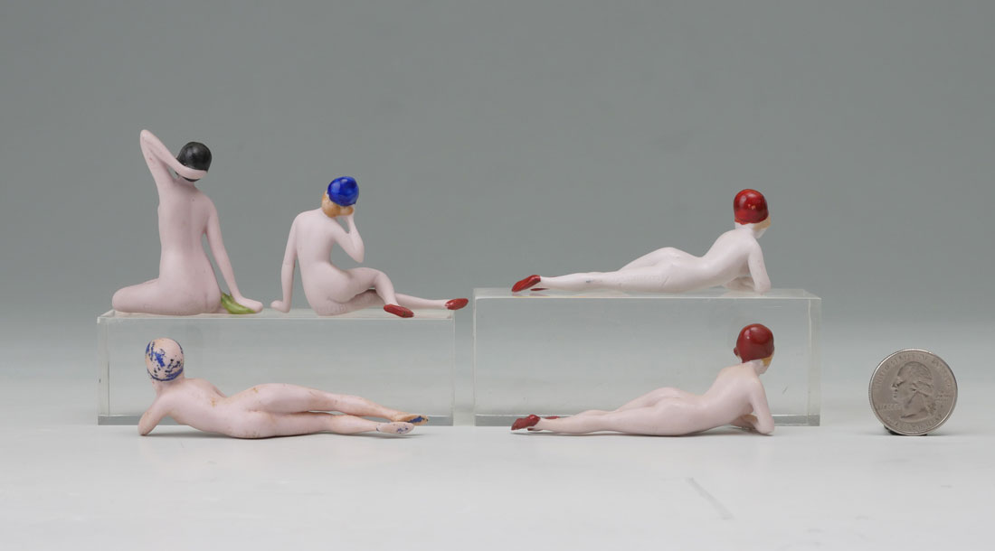 5 NUDE GERMAN BISQUE PORCELAIN BATHING BEAUTIES: Circa 1920 Nude bathing beauties made of German bisque porcelain in different positions. Largest Approx. 2'' h x 1.75'' l X .75'' w.