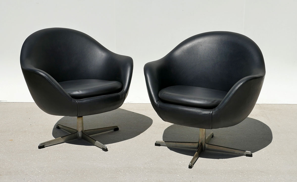 PAIR BLACK VINYL OVERMAN SWEDISH MODERN SWIVEL LOUNGE CHAIRS: 2 barrel-back swivel lounge chairs upholstered in black vinyl. Made by Overman (tag attached underside), of Sweden. Attached to a 4-legged metal base. Removable cushions. Approx. 29'' h x 30'' l x 26.5'' w.