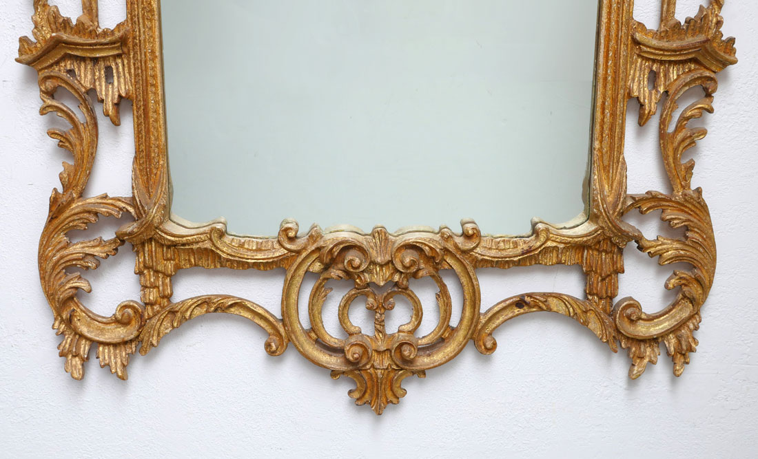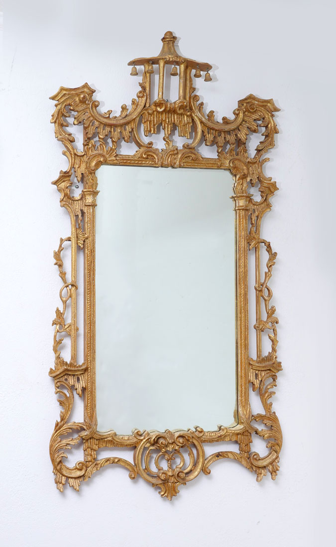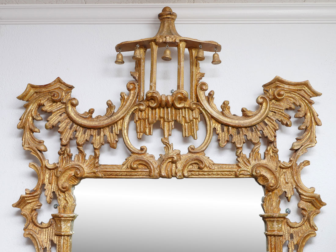 GILT WOOD CHINESE CHIPPENDALE WALL MIRROR: Pagoda crest with hanging bells, foliate scroll carved gilt wood frame, overall 62 1/2'' h. x 31 1/2'' x 1 3/4''.