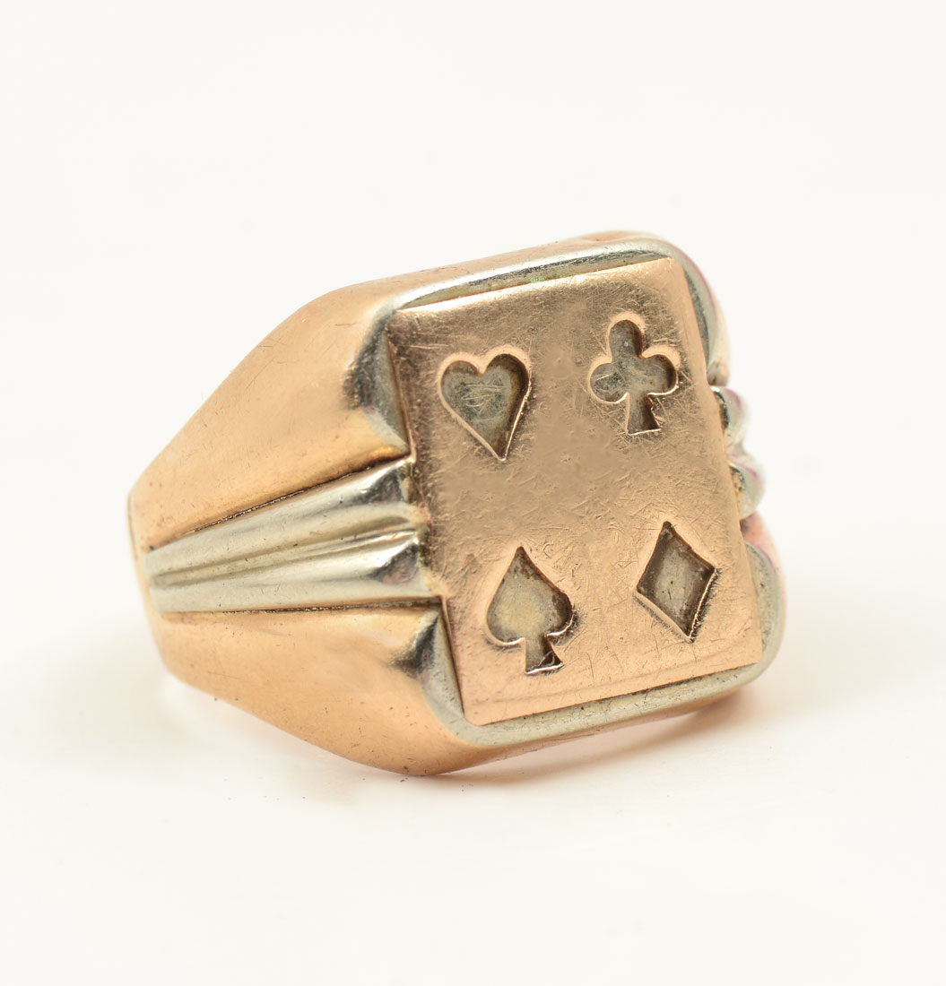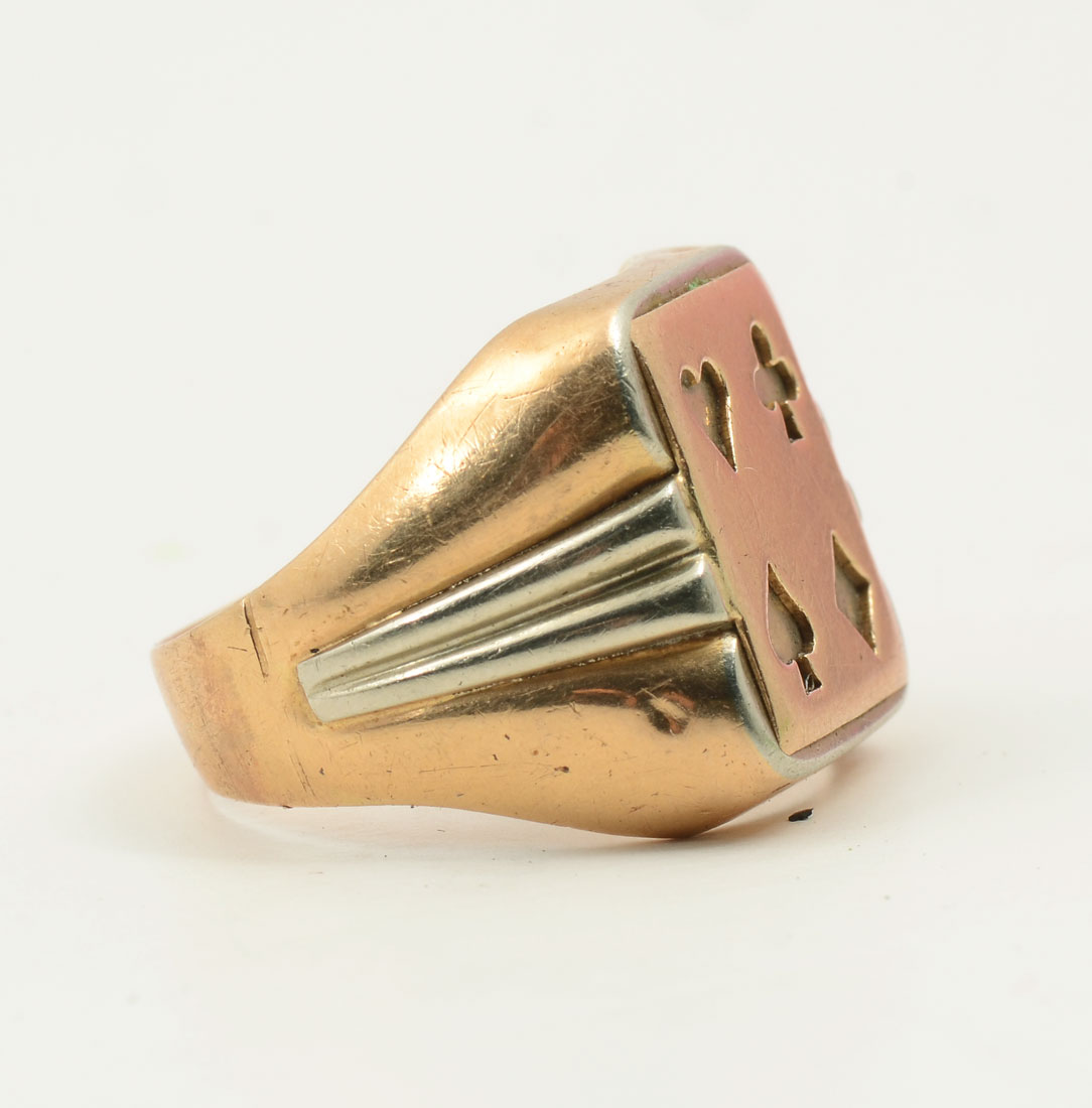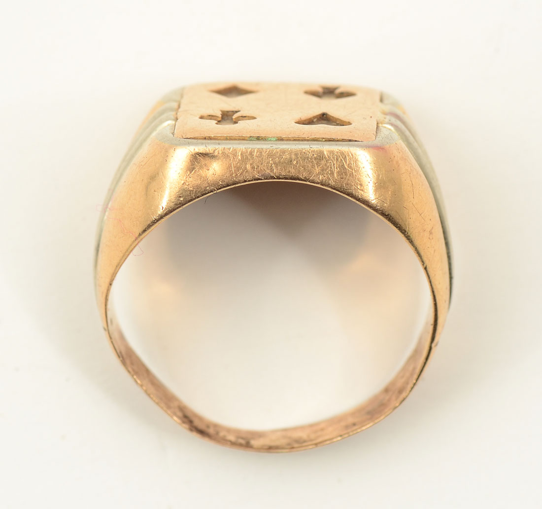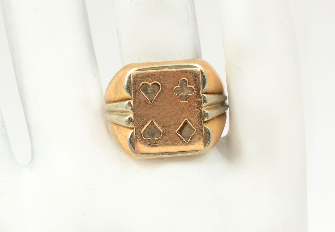 14K GENT'S RING: 14K yellow gold man's ring with playing card symbols. Size: 9