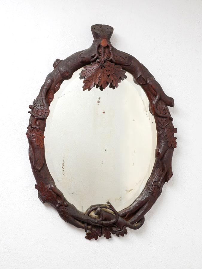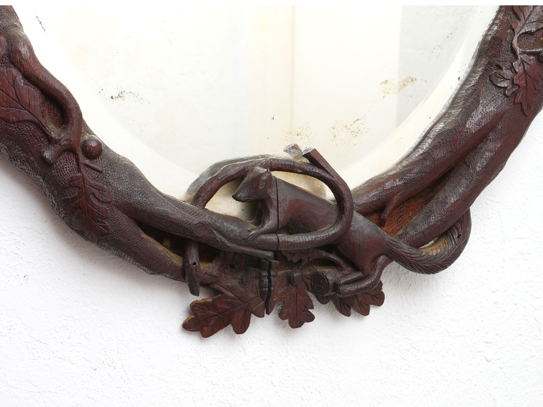 GERMAN BLACK FOREST CARVED OAK MIRROR: Oval carved oak frame with acorns, leaves, and squirrel. Overall measures 33 1/2'' h. x 22'' x 2 1/4''.
