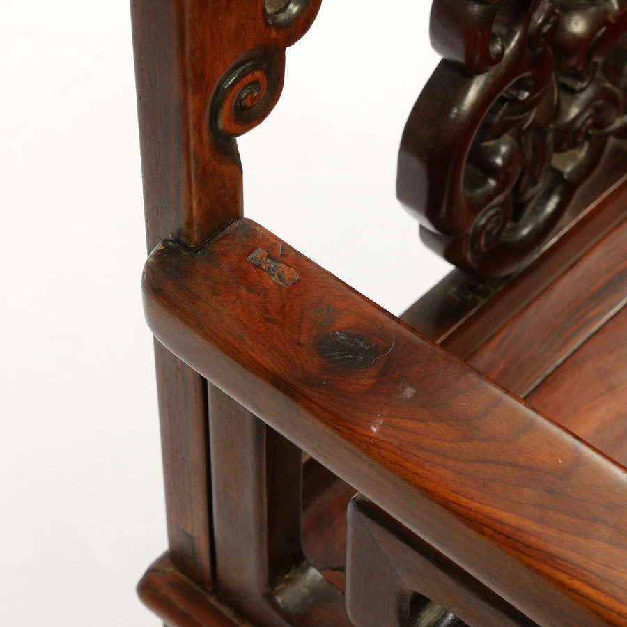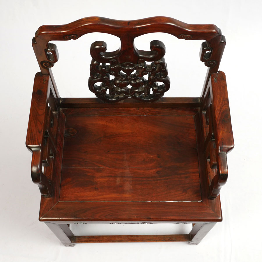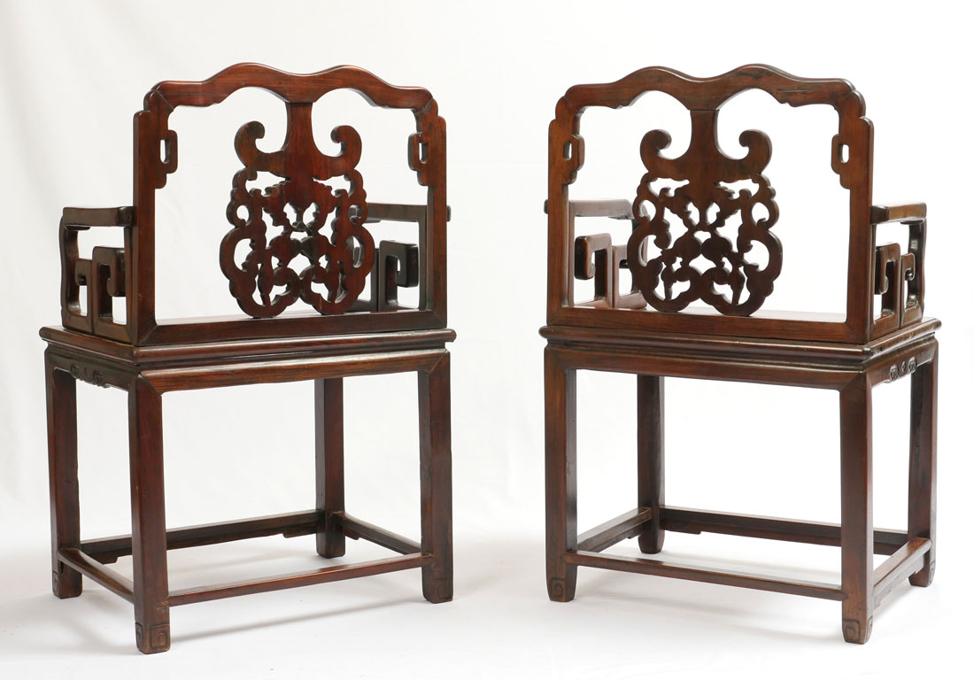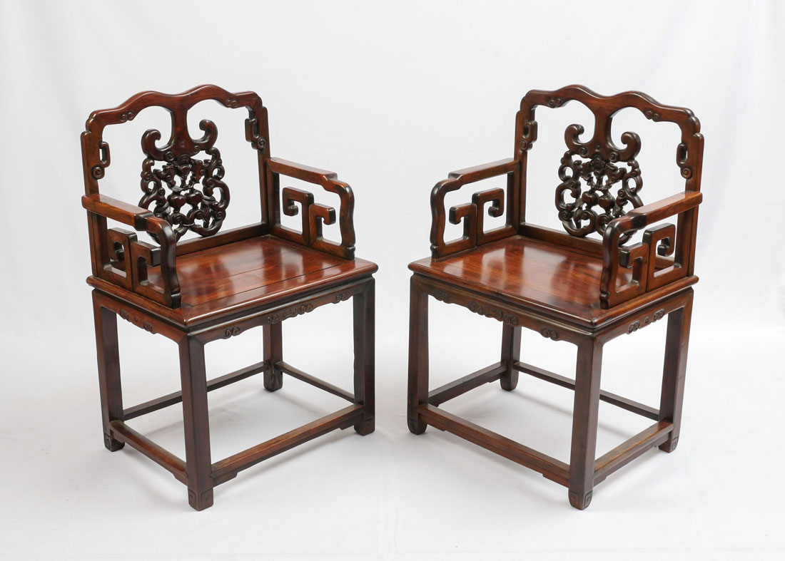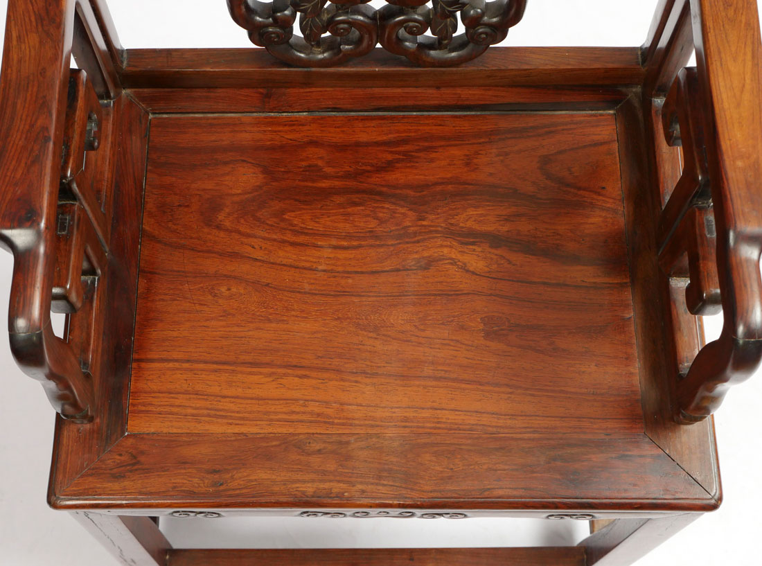 2 HEAVY ROSEWOOD CHINESE ARM CHAIRS HUANGHUALI?: Nicely detailed carved and shaped back with bat and fruit decoration, carved arms and skirt. Through tenon construction, heavy rosewood or possibly huanghuali. Measures 38 1/4'' h. x 25 1/4'' x 18''.