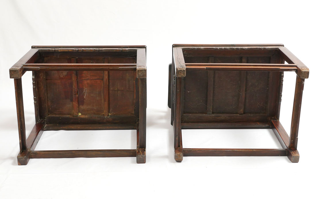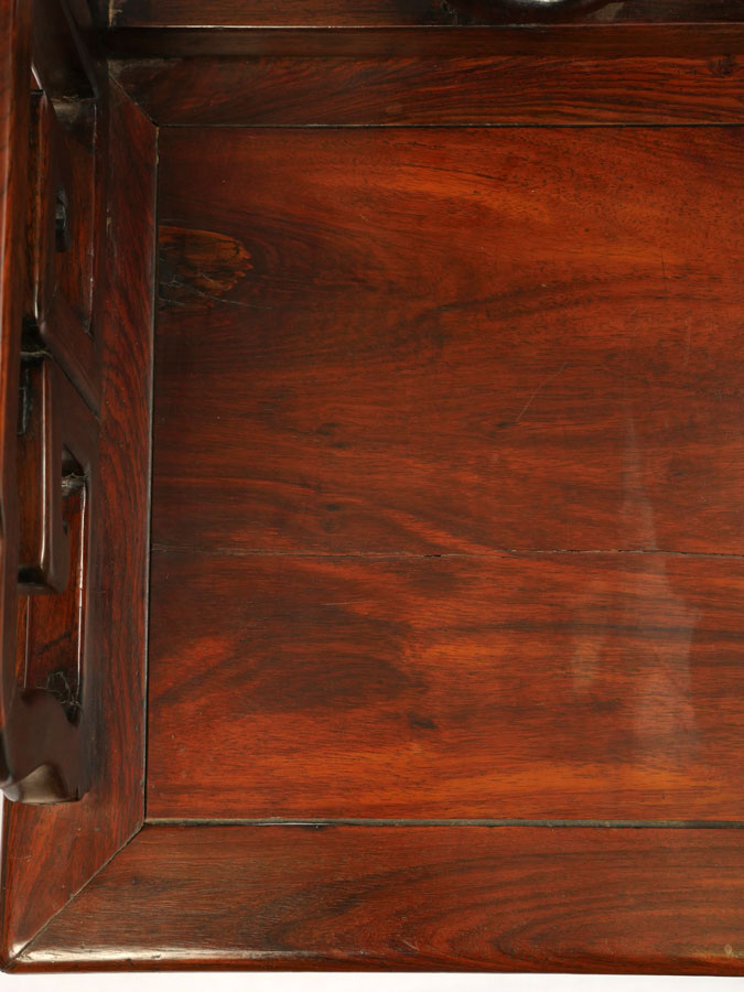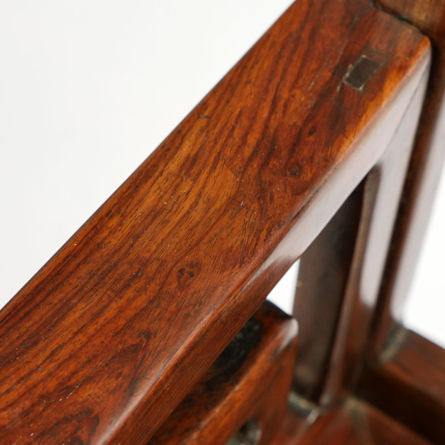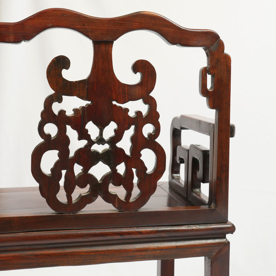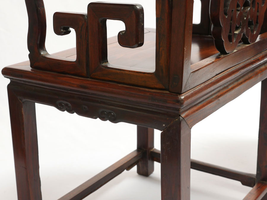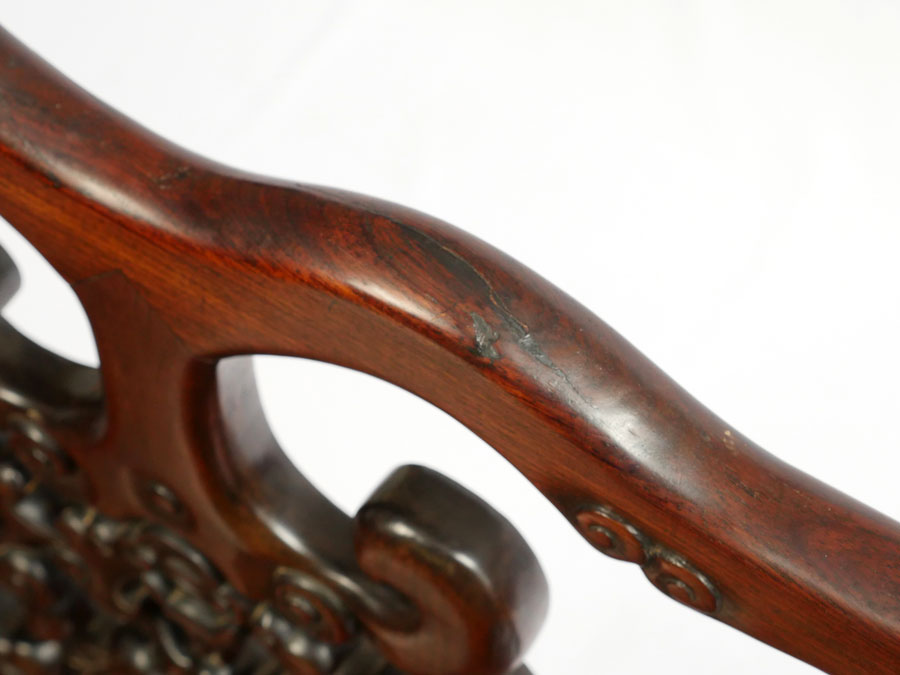 2 HEAVY ROSEWOOD CHINESE ARM CHAIRS HUANGHUALI?: Nicely detailed carved and shaped back with bat and fruit decoration, carved arms and skirt. Through tenon construction, heavy rosewood or possibly huanghuali. Measures 38 1/4'' h. x 25 1/4'' x 18''.